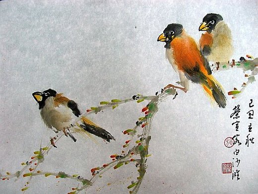 繪法:羊毫筆籐黃醮赭石筆尖再醮墨紅寫背,濃墨寫翅.尾。