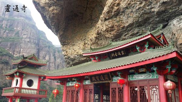 通往靈通寺的路途沒有多少奇特之處,但靈通寺卻給我們另一種震撼。靈通寺在大帽峰的一個石洞處。大自然鬼斧神工,在大帽峰中部風化開一個兩百多平方米的大洞,靈通寺就建在洞內。門口是萬丈深淵,頭頂是聳入雲天的山峰。遠望,它有點山西懸空寺的風采,又像一個神龕嵌入巨石中。梵音在山間回響,煙火味在洞內彌漫,讓人暫時忘卻俗世的煩惱。一副對聯“靈氣煙霖堪悟道,通心經卷早忘機”就道盡此中真味。此時門口閃過珍珠般的亮光,原來是山上的水滴從峰頂飄落,形成稀稀疏疏的珠簾。水珠無聲地飄過,仿佛往事快速閃過腦海,我們無法看到它從哪裡飄落,又將飄到哪裡。據廟祝介紹,靈通山共有十座寺廟,每一座都有它的奇特之處。