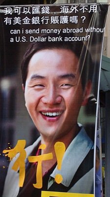 詳細地讀讀,上面印着的是:「我可以匯錢,海外不用有美金銀行賬護嗎?」我讀不大懂這兩句話的意思,直到讀完華文下面的英文:「CAN I SEND MONEY ABROAD WITHOUT A U.S. DOLLAR BANK ACCOUNT?」後,才恍然大悟!(見下圖)