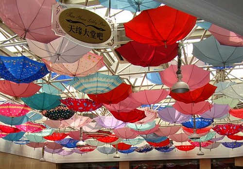 國內外建築物的吊頂我見到很多,但最為欣賞的是在黃山市某旅社的大堂餐廳,以倒懸各種顏色的彩傘構成的吊頂,最為雅緻美觀(見圖)。