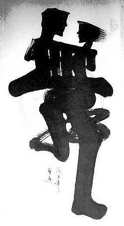 書畫室開設在目前已經非常商業化的永定土樓中原民宅中,雖然夾在一些土產、禮品商店之間,但筆者遠遠就給幾幅書法所吸引,那是我認為很有獨創性的、在象形的漢字上更進一步發揮「型」的優勢的「另類」書法!