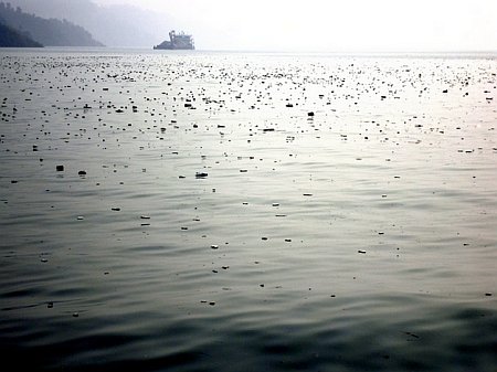 筆者趕快準備好照相機,要為這一群不知名的魚類或其他水上生物攝影留念。但越來越近時才看到,這一群物體全然不是生物,而是漂流在江上的污染物!有塑料瓶、空鐵皮罐、聚荼乙烯泡沫盒等等等等……(見上、下兩圖)
