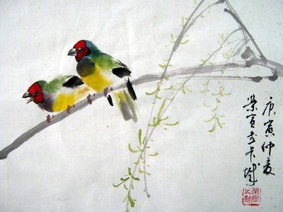 全乾後在頭部的額和耳羽部份钩以硃砂。