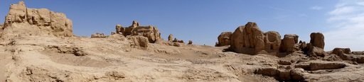 古城目前僅餘下一片廢墟,由於地屬甚為枯燥的沙漠,基本上不見草木。我們由南門進沿中央大道北上,我在途中拍了一幀一百八十度右側全景(見上圖),從街坊房屋寺院等建築殘骸中,仍可感受到昔日繁華的氣象。