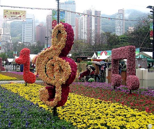 花展是在一個露天的廣場。踏進廣場,我就被那五顏六色的鮮花吸引住。第一個映進眼前的是一個由花朵擺成的豎立著的G音譜號(見上圖),再把眼光放遠望去,還有許多其他的音樂符號,以及各種樂器。更令我興奮的是那一大片我深愛著的鬱金香。經常看到紅、黃、白的鬱金香,那天,呈現在眼前的是五、六種顏色的鬱金香。