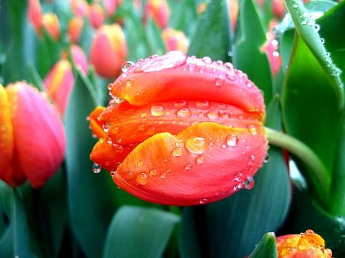 那天,我撐著雨傘,面對著那麼多的鬱金香,一朵朵抬著頭,不畏風、不懼雨的鬱金香,它們深深地吸引著我,讓我不想離開;忽然,在千萬朵鬱金香之中,我發現了一朵垂著頭的橙色的鬱金香,淚水在它的臉頰上(見下圖),是什麼事讓它那麼傷心?啊,橙色的鬱金香,你應該是明亮脫俗,寧靜安逸的,為何在此默默垂淚?難道你這不忍心傷人的少女,反而被人刺傷了?