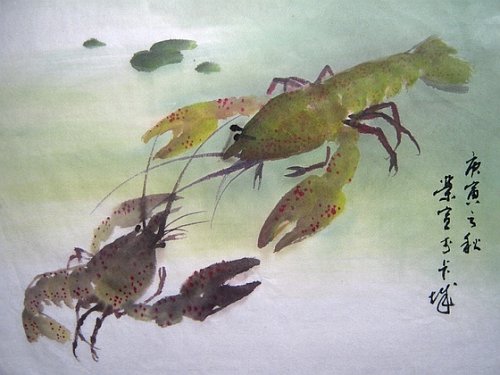 蒼綠再蘸赭墨紅寫頭胸甲,順筆寫腹、尾。