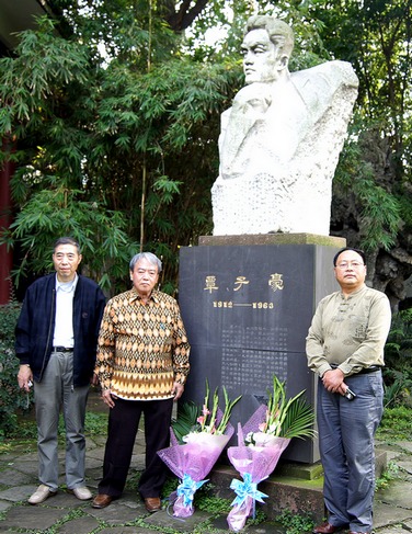 照片說明:九月三十日本刊主編雲鶴到四川省廣漢市的房湖公園,向位於園內的“覃子豪紀念館”中詩人覃子豪的大理石雕像獻花,照片中左起:作家陳立基、本刊主編雲鶴、詩人周道模。