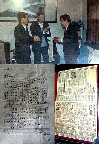 紀念館廿餘年來,維修得很不錯;館內文物雖然不太豐富,但讓我震撼的是,我看到架上排置著我二十餘年前接受覃子豪紀念館籌建顧問證書的照片,我寄給覃老師令弟羊翬先生信的原件、《華僑商報》「新潮副刊」(先父藍天民主編)與《世界日報》「文藝副刊」的剪報等。(見中圖)