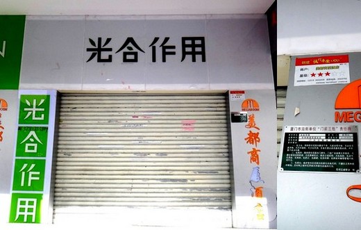 接近了頓覺不對呀,為什麼大門緊閉!(見下圖左)走近一看,真的是關閉了!門上的「責任牌」寫明這是「光合作用」的店面不錯(見下圖右),問問鄰近的店家,都說:關門了!
