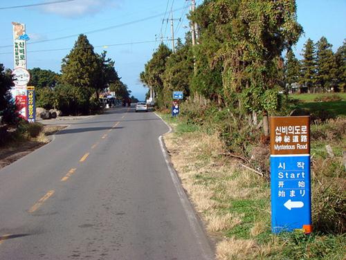 從濟州市沿526國道走4公裡,離大名鼎鼎的“愛情公園”1公裡,有一條不起眼的斜坡,名為“神秘道路”。坡長只有100米,但好像地心吸引力弄錯了方向,令得“水往高處流”。