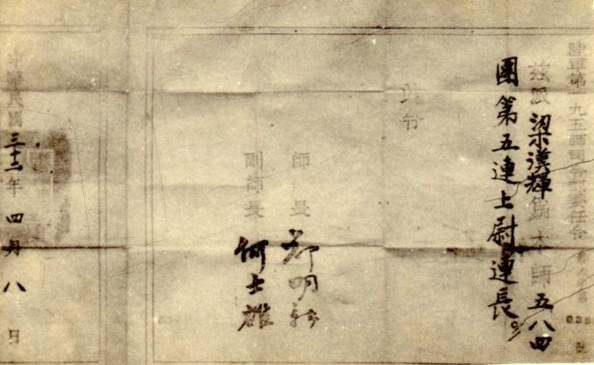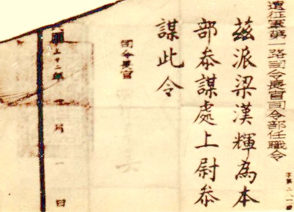 梁漢輝任52軍195師上尉連長令