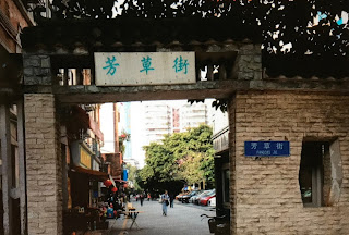 芳草街是條石坂路,鳳君的爸帶他們往惠愛東路口,看地上有塊大石坂,刻有芳草街三個大字.張父說: "芳草街是廣州的老城區,典型的民宅都有趟櫳的正門,非常有特色.明清以來,有很多文人騷客在此結社,歷史記載,曾有芳草精舍詩社而得名. "