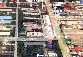 興大舊校園示圖: 作者與諸系友遷出原新生男舍(今女生舍)至住國光路363巷口民宅,右下方校園內紅土網球場旁.舊校大門位今永豐銀行興大分行右邊,舊女舍現學生活動中心(取自Google map)