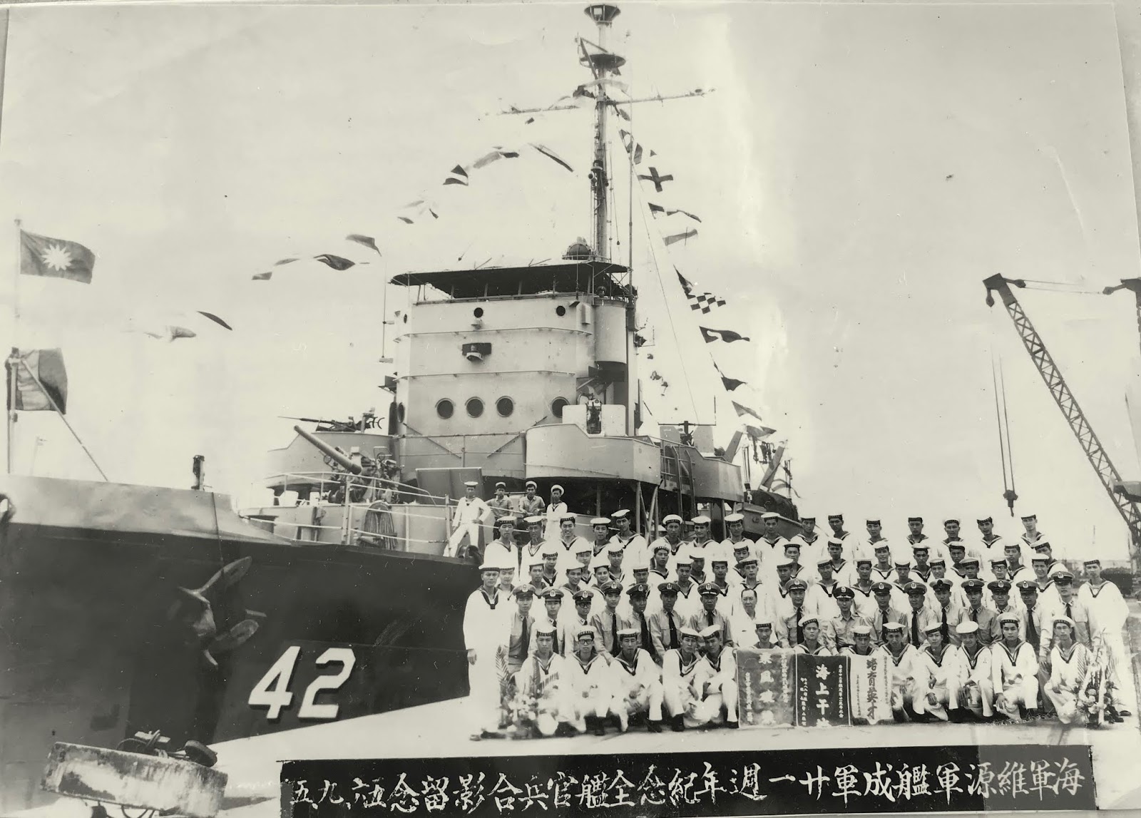 永興維源艦(原42號,1972年除役前改68號) 1967夏21週年艦慶時在左營港全體合影(第二排右一梁華岳少尉槍砲員)