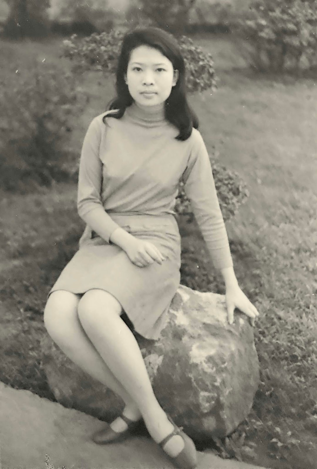 本來,羅撒林(鄭敏夫醫官女友)他們也去的,但由於種種的原因,又回說不去了,真掃興,結果只有我們自己去.我帶了照相機,讓你給我照幾張,可是那天氣候不太好,到了陽明山,只見滿地的杜鵑花,櫻花已凋零了.中午,正在吃野餐時,遇見好多同事,他們都朝著你看,沒把你看臉紅了.
