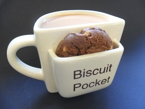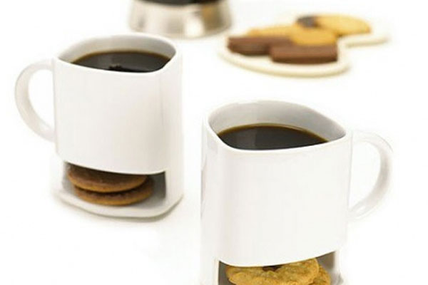圖片中的咖啡杯,一個是底下多了小空間,可以裝些小點心,另一個則是在旁邊多了一個"口袋",一樣可以裝些小點心。