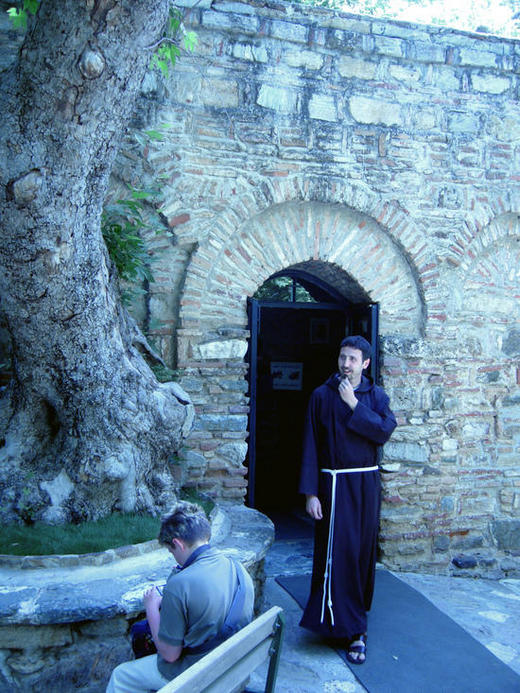 聖母瑪麗亞故居現在就是一個石頭砌的小房子,裡面有東正教修士、修女進駐讀拉丁語經文,小房子裡面不能拍照,但東正教修士的衣著很古老傳統(請看我網路借來的照片no.2)。小房子下有三個噴泉:愛情之泉、健康之泉、財富之泉。當然聰明人三個噴泉的水都喝。有效嗎?土耳其之旅領隊小威小姐笑笑說,她喝了n次愛情之泉,也沒愛情出現……。