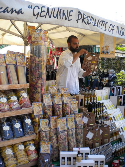 假日就來欣賞很有樂趣的托斯卡尼假日市集(holiday market);因為我們是星期六遊西恩那(Siena)和聖吉米納諾(Sam Gimignano),星期天人在比薩(Pisa)和盧卡(Lucca),我只能姑且猜猜這些路邊攤販(street vendors)應該是假日才出來擺攤的。對於外國人而言,看看這些很托斯卡尼風(Tuscany style)的商品還挺有趣的,對於我個人而言啦!但我一樣也沒買,因為不會做義大利料理,又怕裝紅酒橄欖油的瓶子搭飛機時弄破,唯一的消費是請同行朋友在照片中其中某一攤喝義大利柳橙汁,對這些路邊攤老闆感到不好意思,還一直給人家拍拍拍…….。