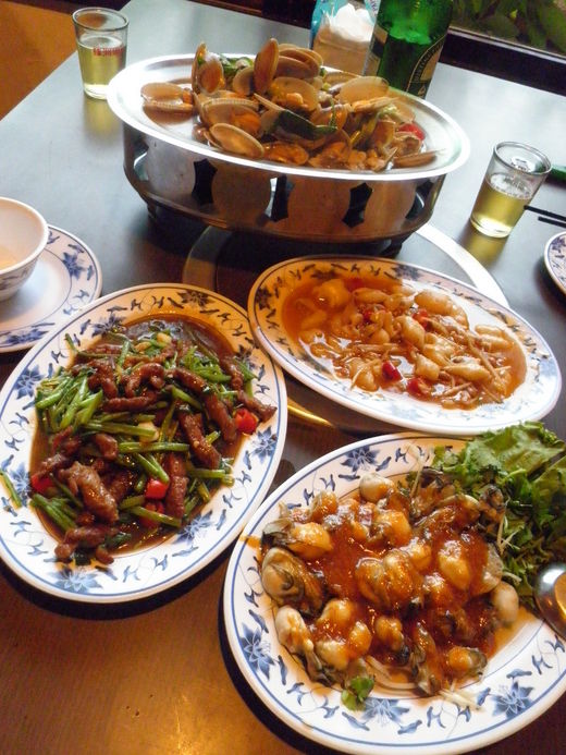 下午5:40 夠早了吧!但一進去原本耕讀園餐廳裝潢區域已客滿,好不容易已經有一廂房買單了,我們就到A7四人座餐桌來享用晚餐。我覺得菜色不算特殊,但也不差,海瓜子吃到最後兩顆沒開的,剝開後發現有一顆是壞的、黑黑的,我們也沒打算反映,只是本能地show在盤子上,買單時,櫃台接到A區服務人員通知,主動扣掉海瓜子NT$220的費用,我們都在偷笑,也許這是大白鯊總是莫名其妙高朋滿座的原因之一吧!就是抓住客人kimoji (奇蒙子)ㄋㄟ。