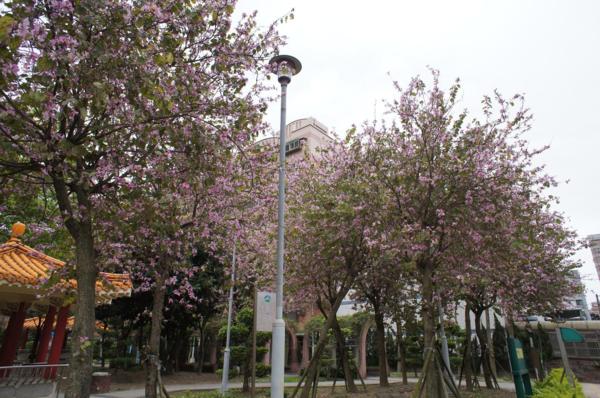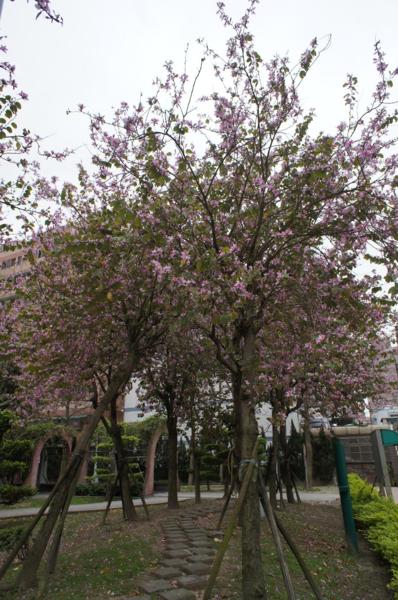 之前文章照片中搞不清楚路旁開滿粉紅色花朵的樹樹是什麼植物?原來是羊蹄甲(Orchid tree),謝謝瀟灑小姐的告知,其實家裡附近的公園就有好幾棵盛開的羊蹄甲,但我老實說,我們台灣的許多公園都好醜,設施與路燈都亂配一通,你看看我拍的實景照片就知道,實在很想躲開那些醜醜的公共設施,但很難;也許我很職業病,但政府的投標案如果設定「設計」與「工程」必須搭配、相輔相成,台灣的許多公共建設可以更具有美感與質感。