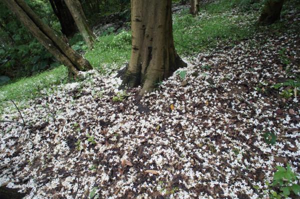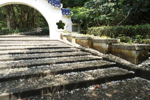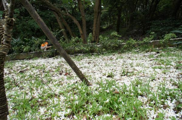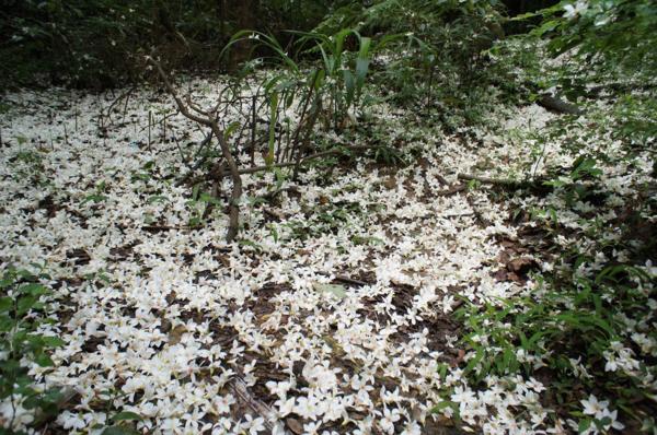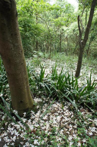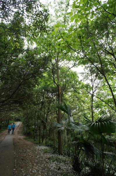 星期天好悶好熱,為了實踐要吃也要動的理念(**要少吃多動,真的要有很多毅力~),星期天又去健行,發現原來我身邊、距離那麼近的地方-桃園市區內的虎頭山,就有開滿花朵的油桐(Tung oil tree)可欣賞,滿地的白色落花,我讚嘆它們為:「白羽花毯。」(Tung blossom)