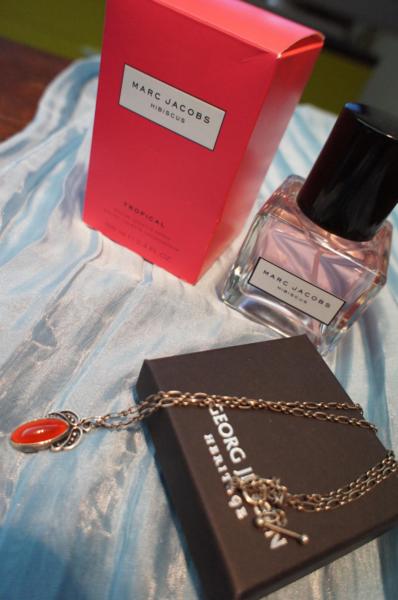 在飛回台灣的長榮飛機上,我原本想買兩樣免稅商品:1.喬治傑生(Georg Jensen)的紀念款項鍊(忘了哪一個年份的紀念款)。2.Marc Jacobs-Tropical Hibiscus 2012,熱帶木槿花限量香水。Georg Jensen項鍊沒有貨,我的個性像遇到這種情況,我會告訴自己:「沒現貨,省下幾千元也不賴啊!」;而Marc Jacob Hibiscus香水,飛機上是沒能夠試聞的,在不知道實際香水味道的情況裡,挺冒險地買下的Marc Jacobs Hibiscus木槿花香水,結果則令人滿意,帶有「喜新厭舊」小壞壞因子的我,最近75%機率都擦新敗的Marc Jacobs Hibiscus木槿花香水,今天也不例外。