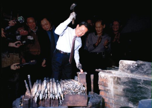 小時候我們家的生活很清苦,也很苦悶,每當心情不好、或遇見憤憤不平之事時,我都會駐足在打鐵鋪前面,看著上身赤膊,胸肌結實的打鐵工,不急不徐的,有節奏的,一人一錘的打著鐵,那清脆單調的叮叮噹噹聲,像是一錘一錘的捶擊著我的不平,像是一錘一錘的捶擊著我的憤怒。