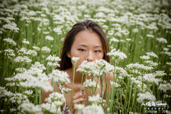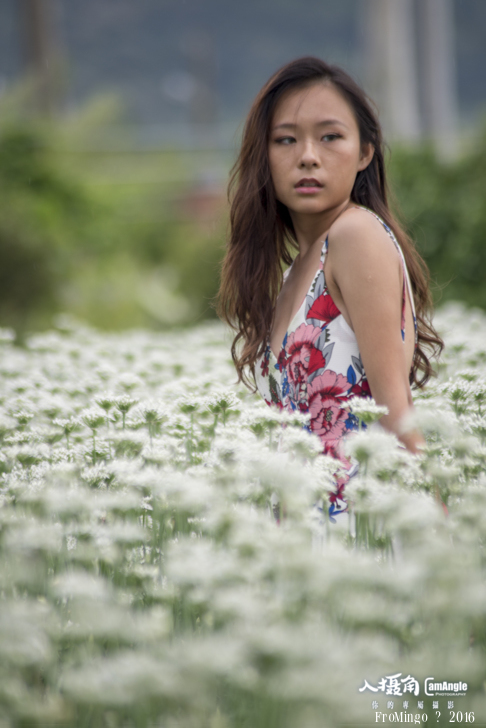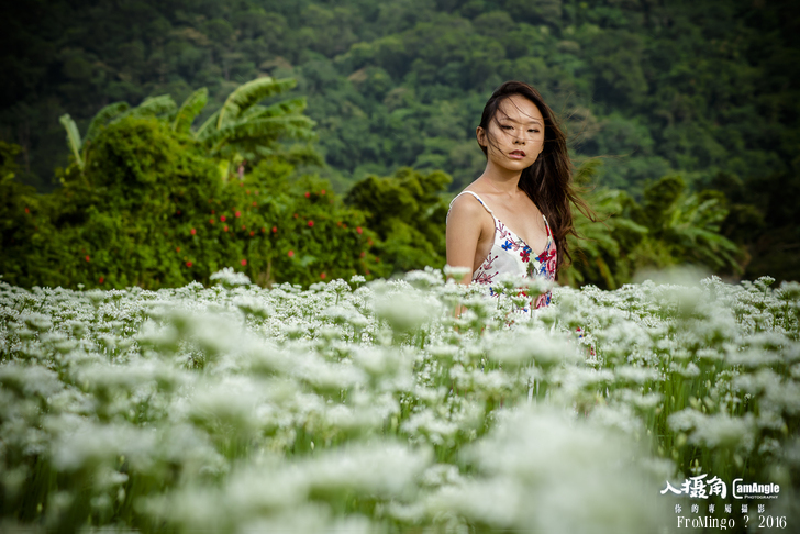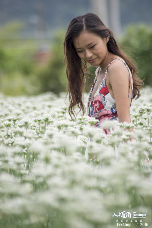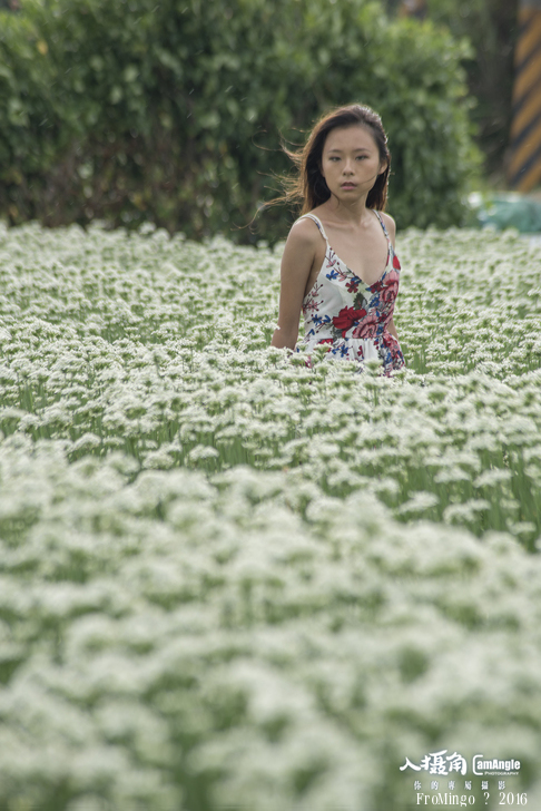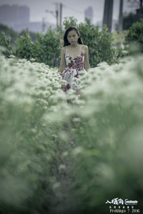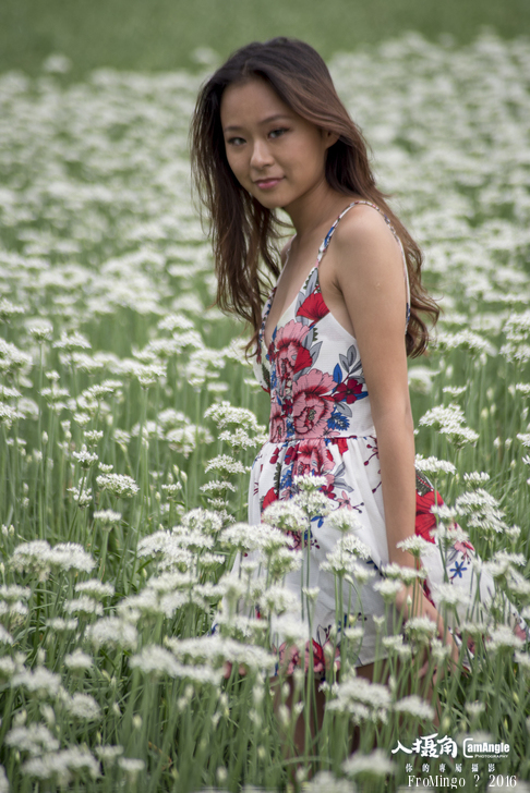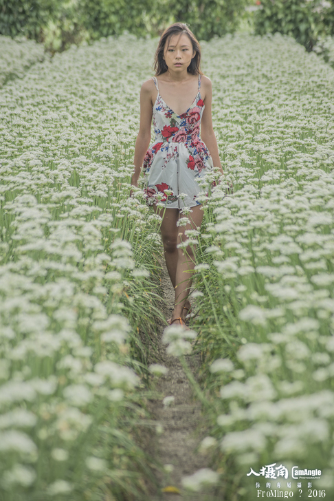其實韭菜花拍攝人像來說有點矮,就跟大花波斯菊差不多,只不過有幾塊田的推土似乎比較高,加上女孩比較嬌小,所以搭配起來較為剛好。