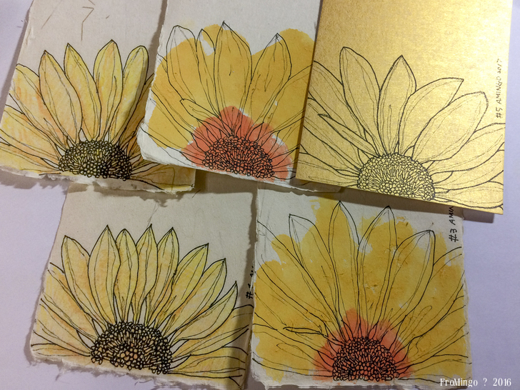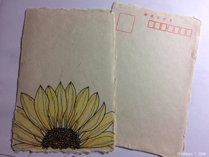 因為畫上了癮,也更熟悉著向日葵的形體與畫法,所以找出了多年前在大阪心齋橋和紙店買的手作紙明信片,然後很勇敢地畫了下去,即使紙張不是太適合代針筆,也不適合色鉛筆的摩擦,但還是小心翼翼地去完成它。