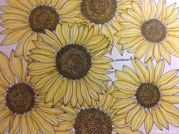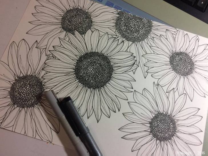 因為喜歡向日葵,也喜歡且擅長著代針筆勾勒,所以在白紙上直接的畫了一個向日葵,畫完後感覺還不錯,於是又在其它的角落中持續的添加著,畢竟我不是個擅長留白的創作者,也就盡可能的填滿它。