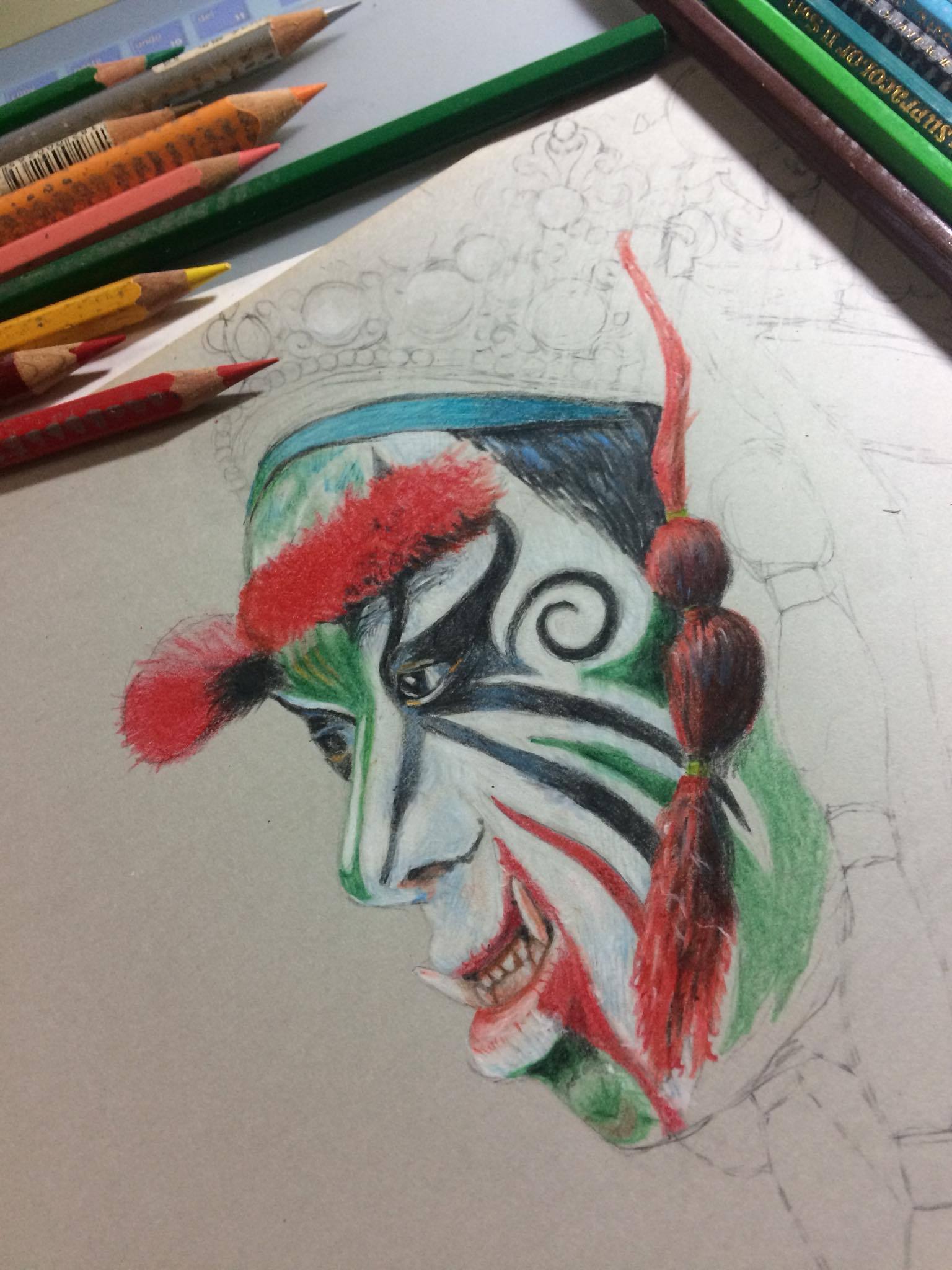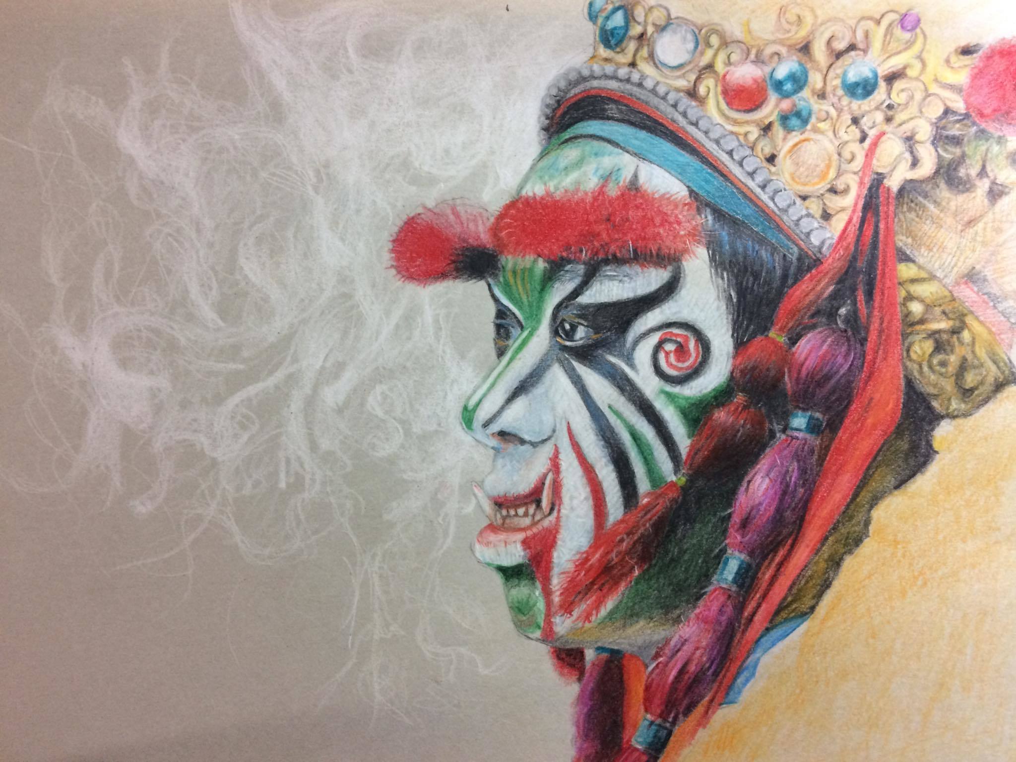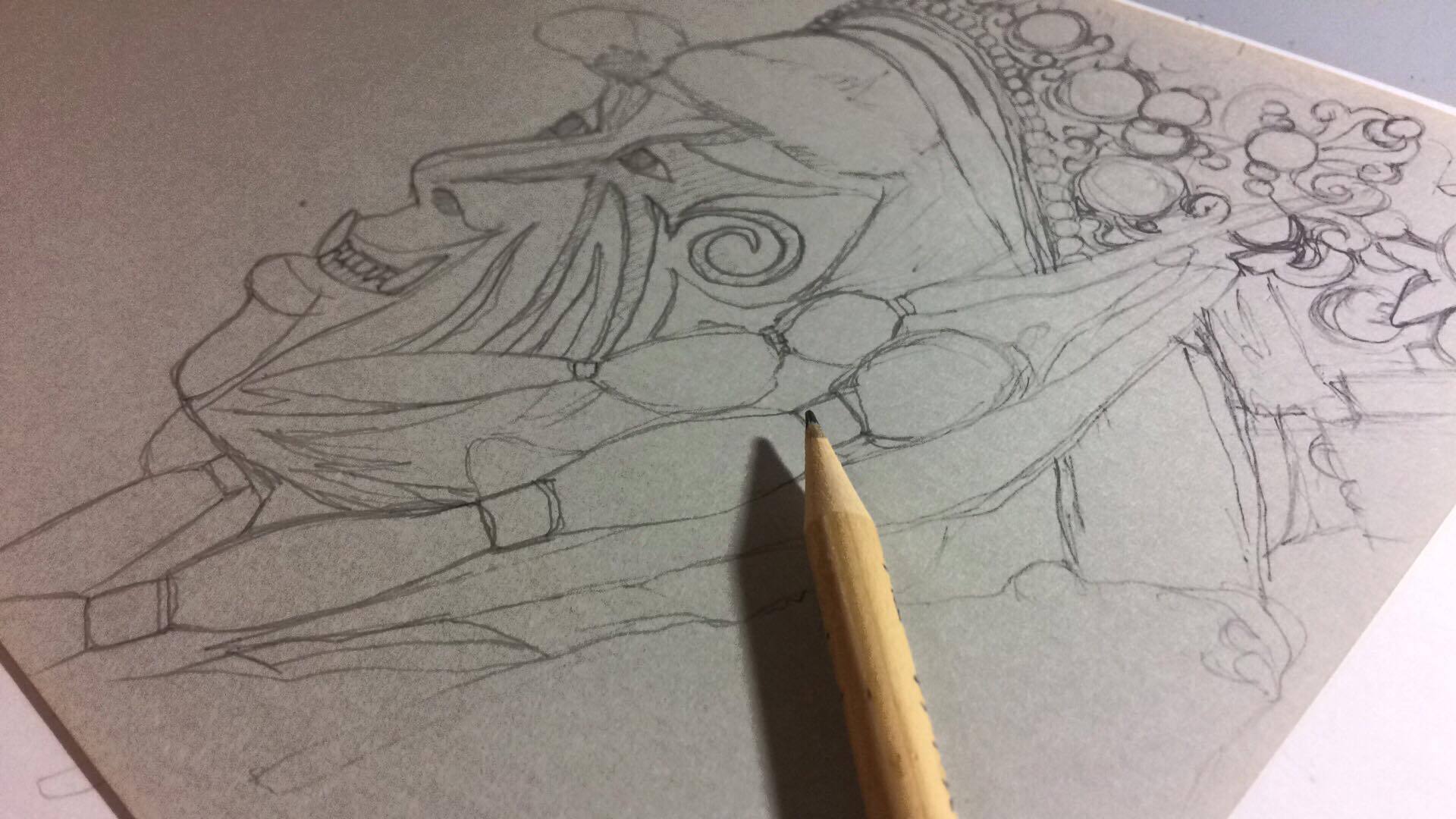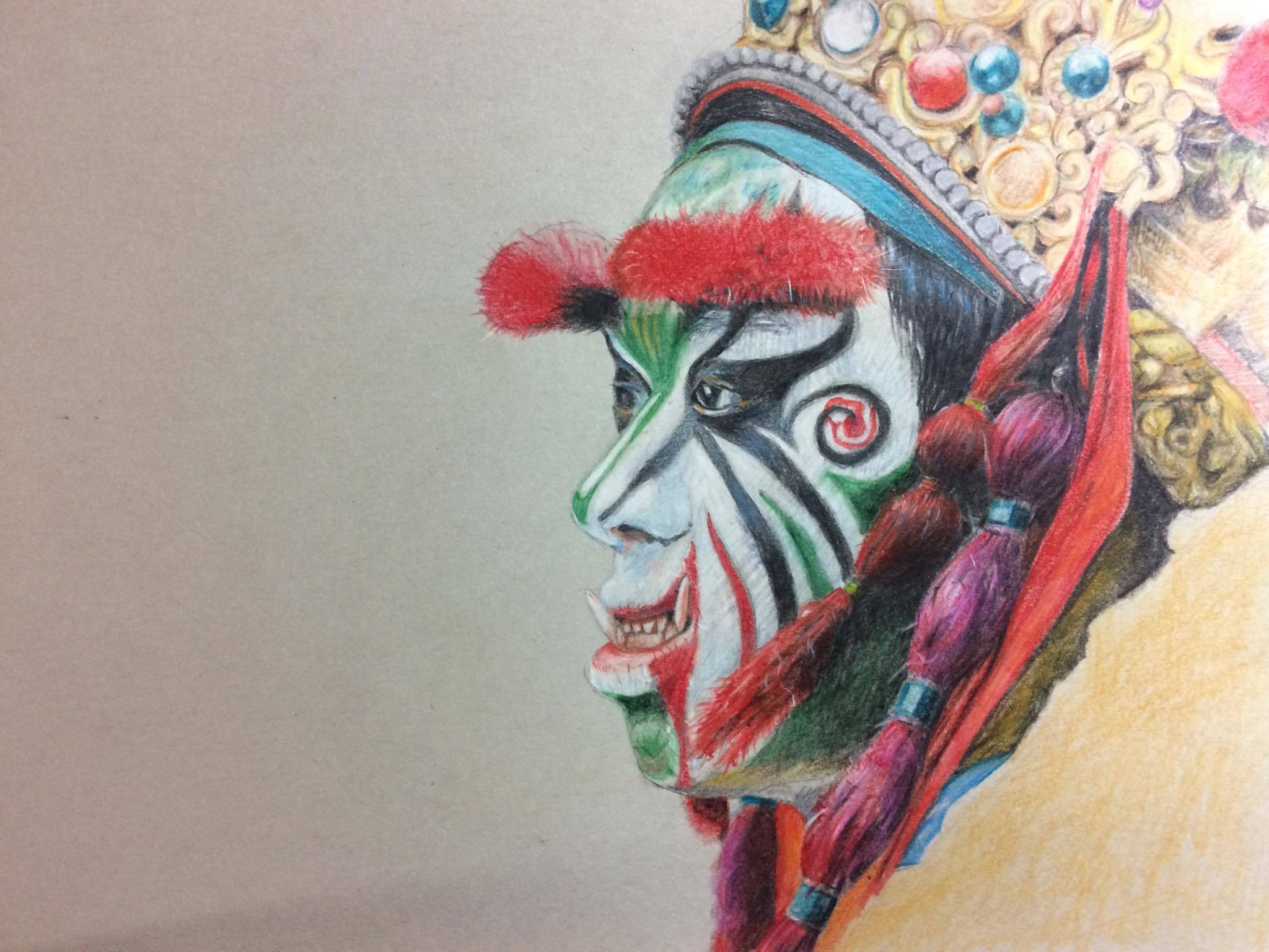 從一開始的初稿,大概就花了一兩個小時,因為是精細描繪,所以得更謹慎,尤其又是人物臉譜。
