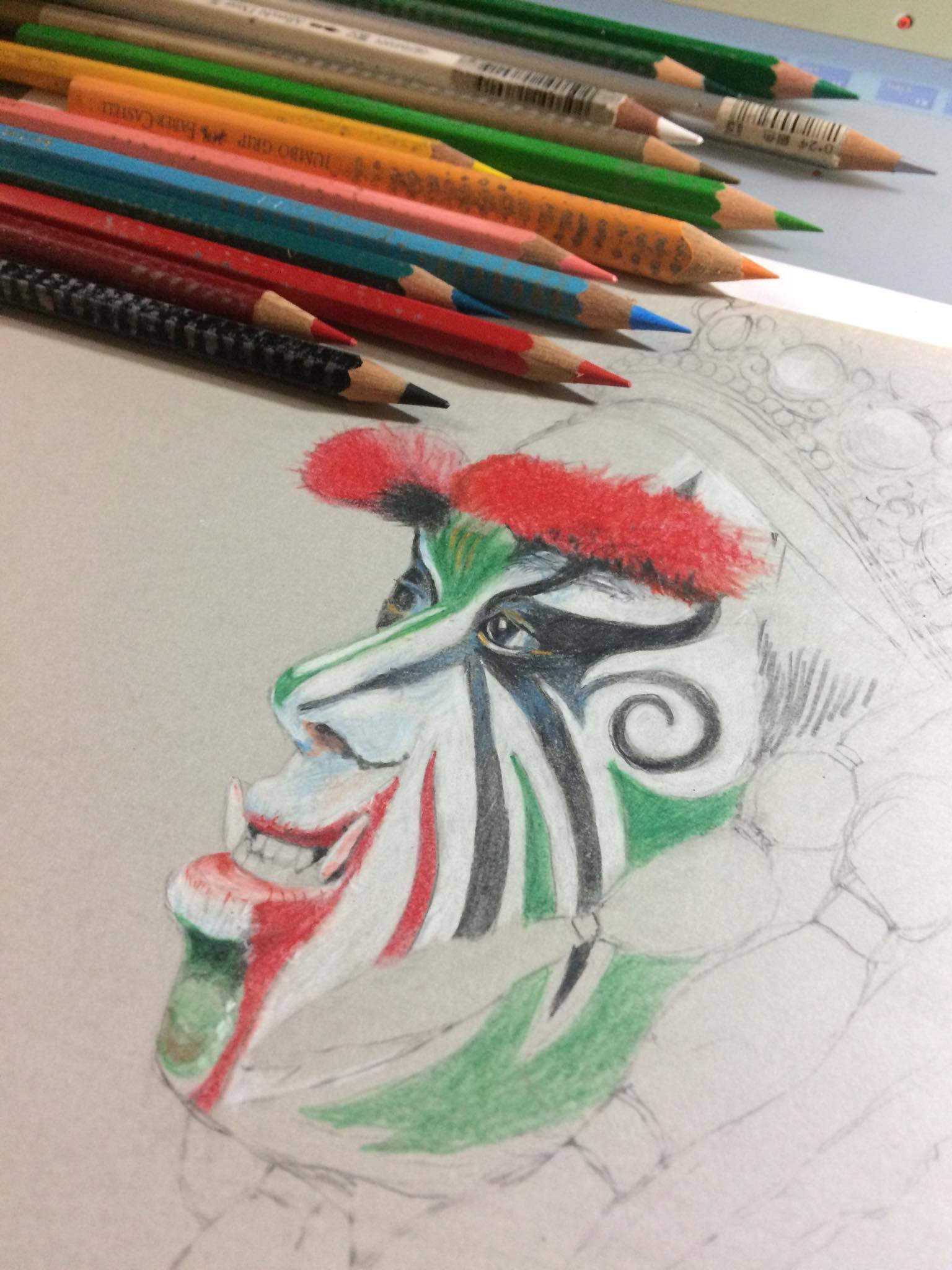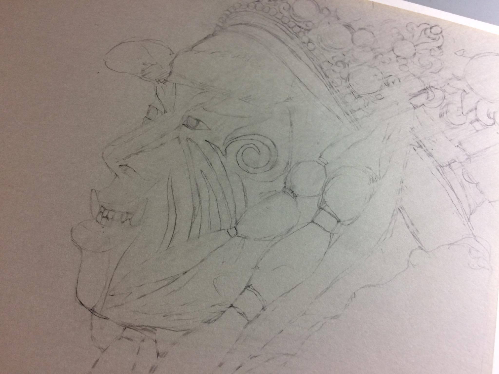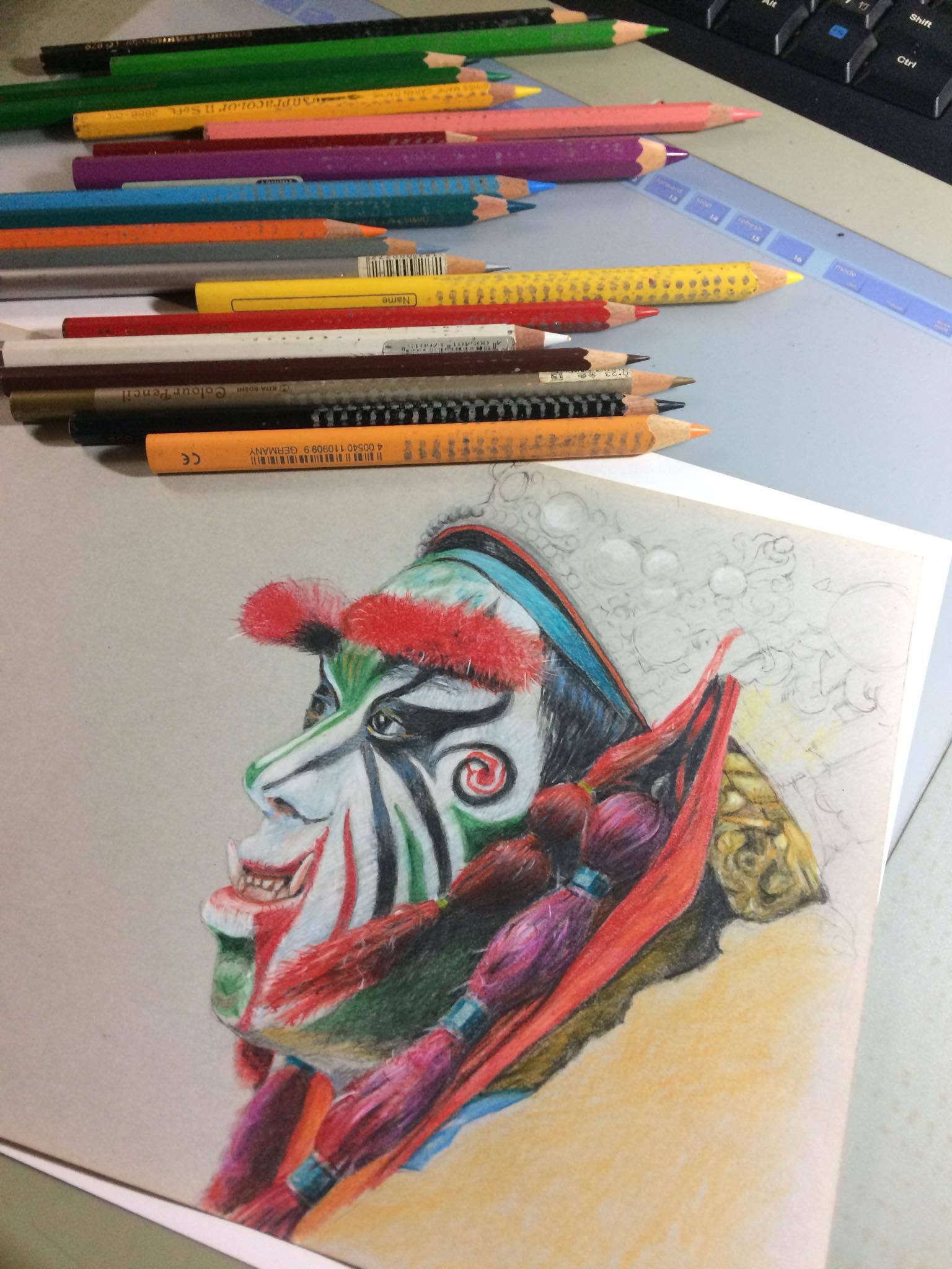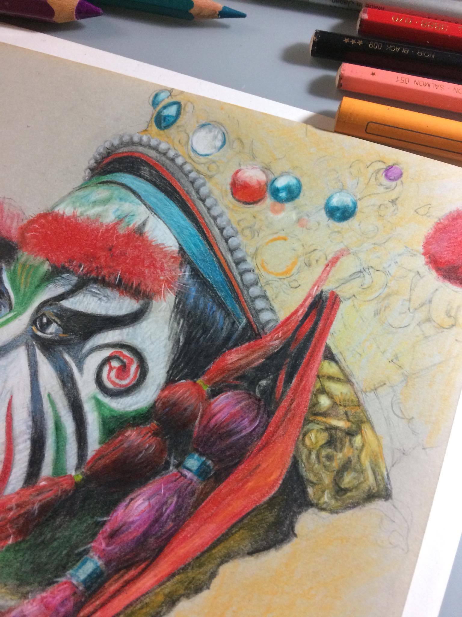從一開始的初稿,大概就花了一兩個小時,因為是精細描繪,所以得更謹慎,尤其又是人物臉譜。