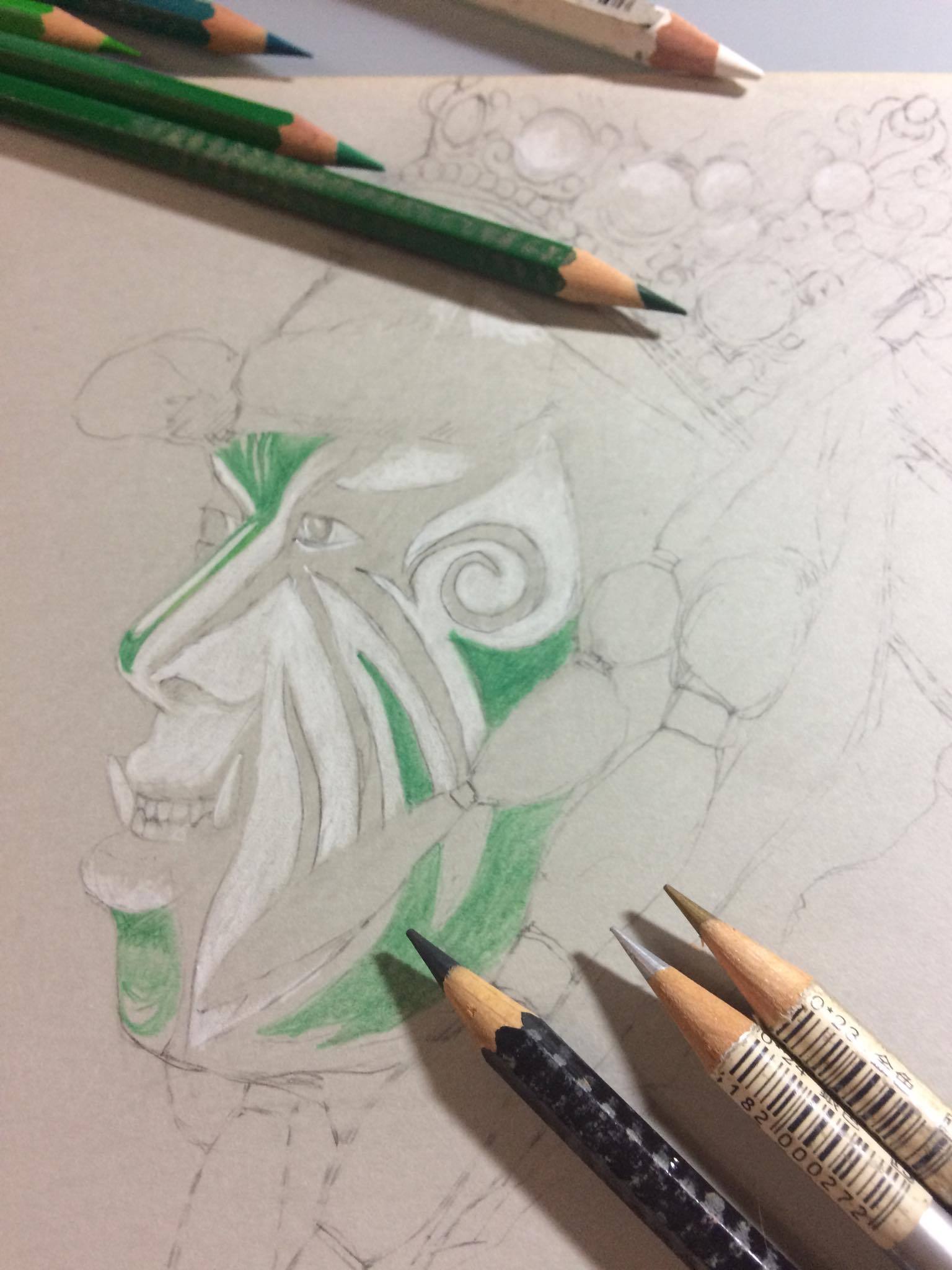 因為官將首臉譜底是白色的,所以挑選紙張我用了淺灰色調的紙張,而其頭盔(冠),則有許多的金銀色彩,剛好我有金銀的色鉛筆,可惜金色太深,不是那麼適合。