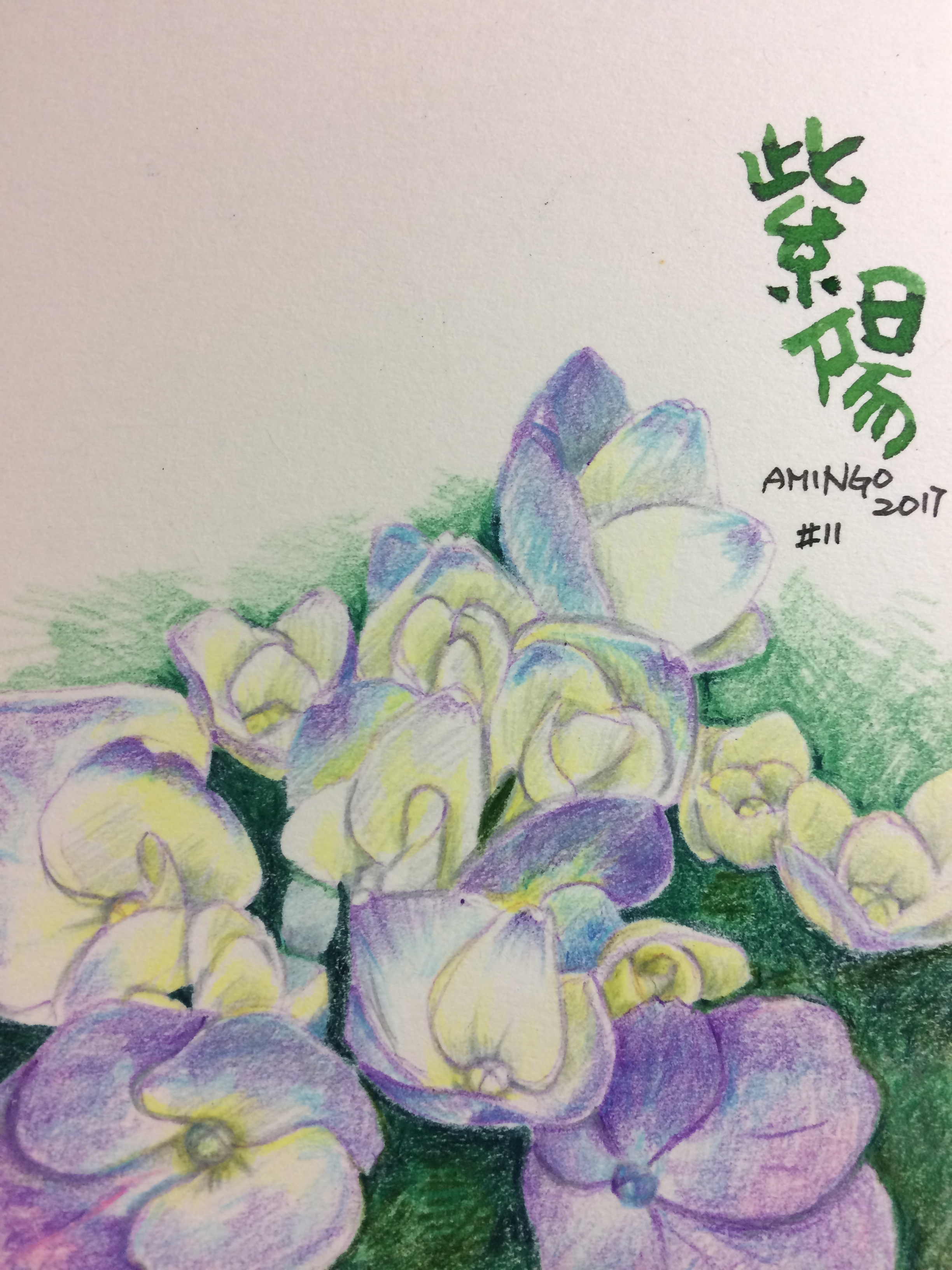 紫陽花,一般俗稱繡球花,顏色係因土壤內礦物質的不同而變化,這畫的不是盛開,而是即將盛開的狀態。