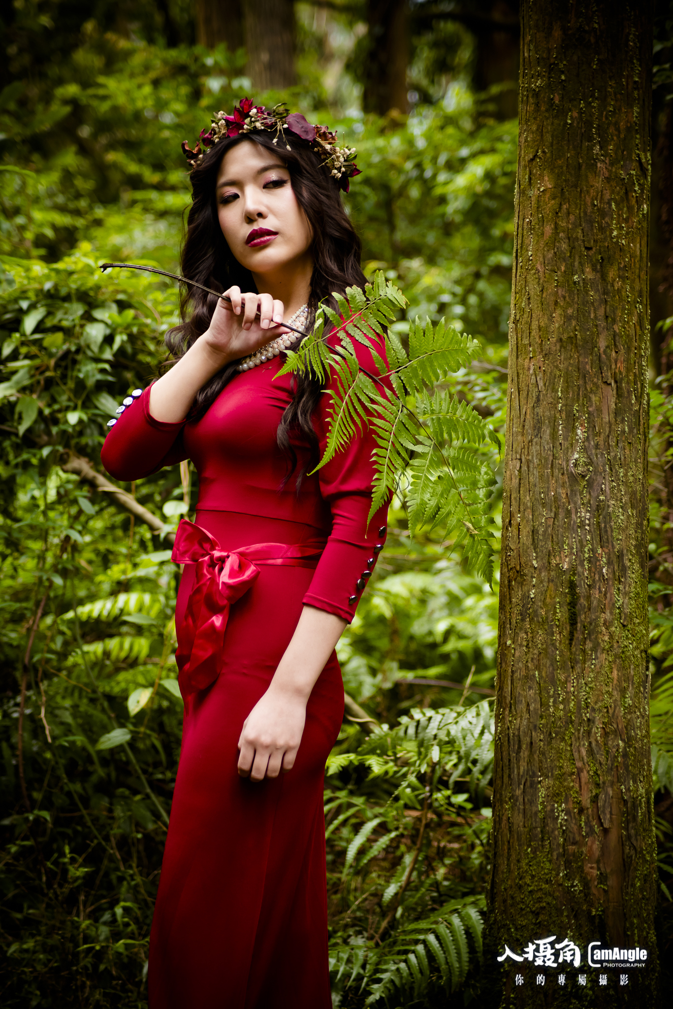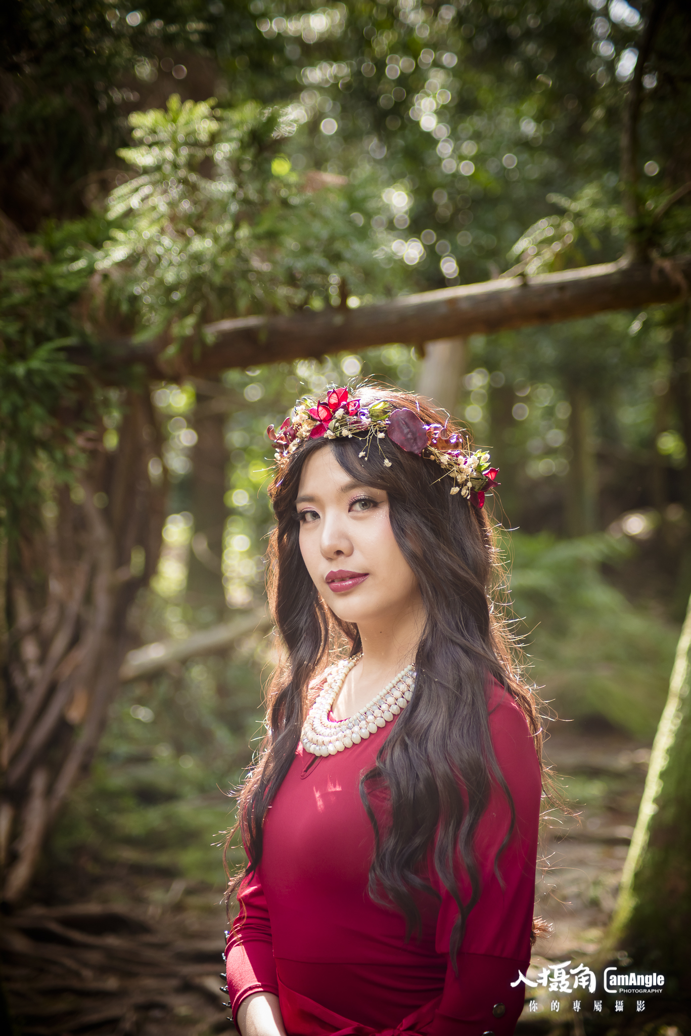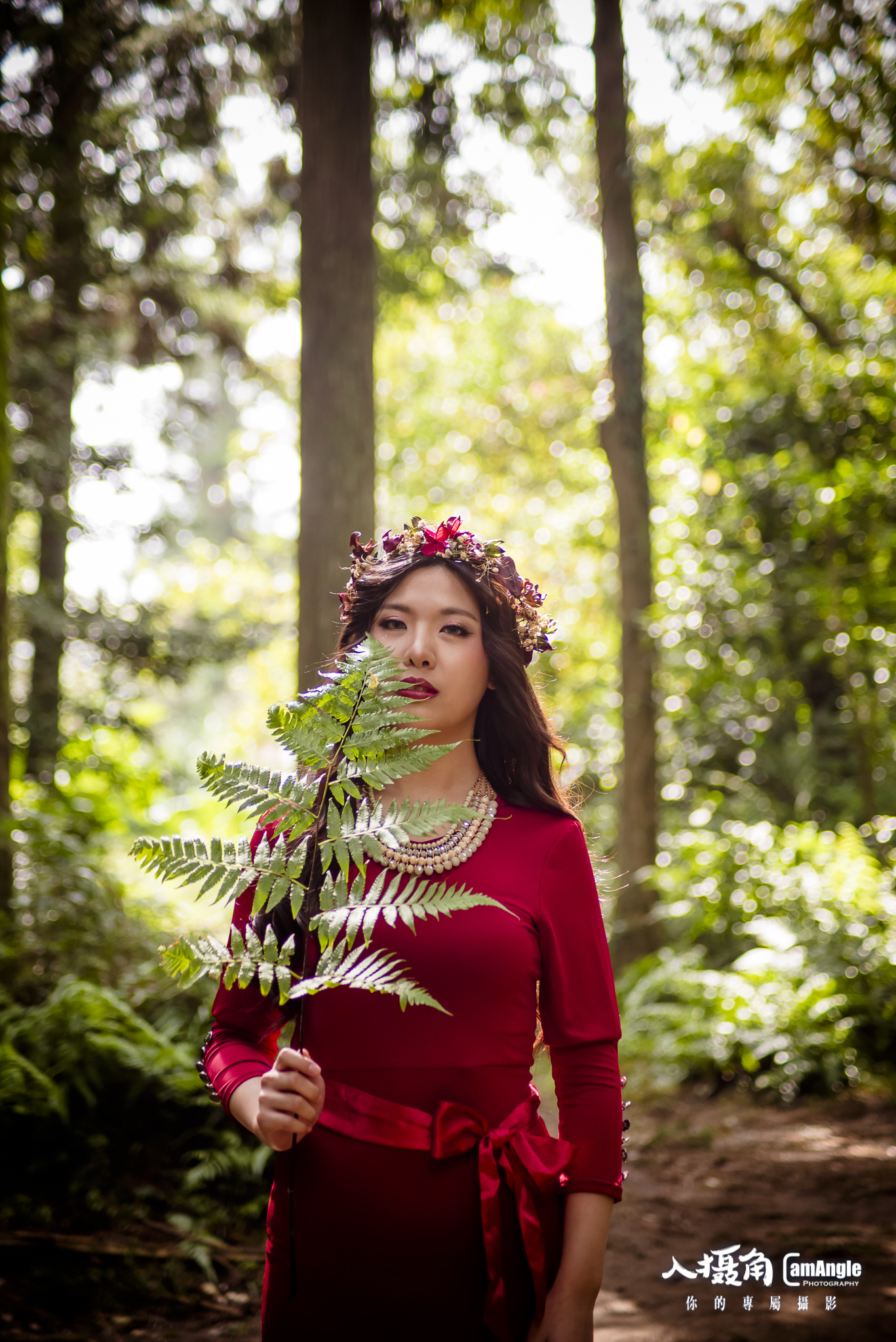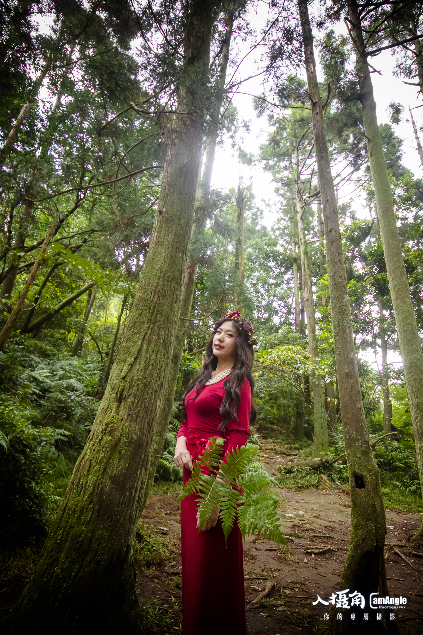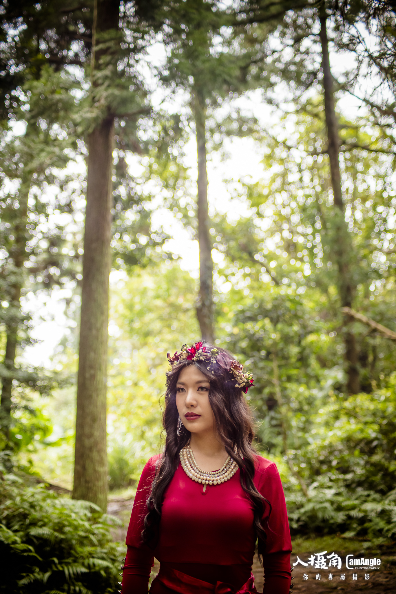 有服裝與造型的安排,在陽明山的黑森林中,呈現出了一種拍廣告的樣貌風格,像是森林公主的質感,帶點原住民風味,又有點歐式的色彩。