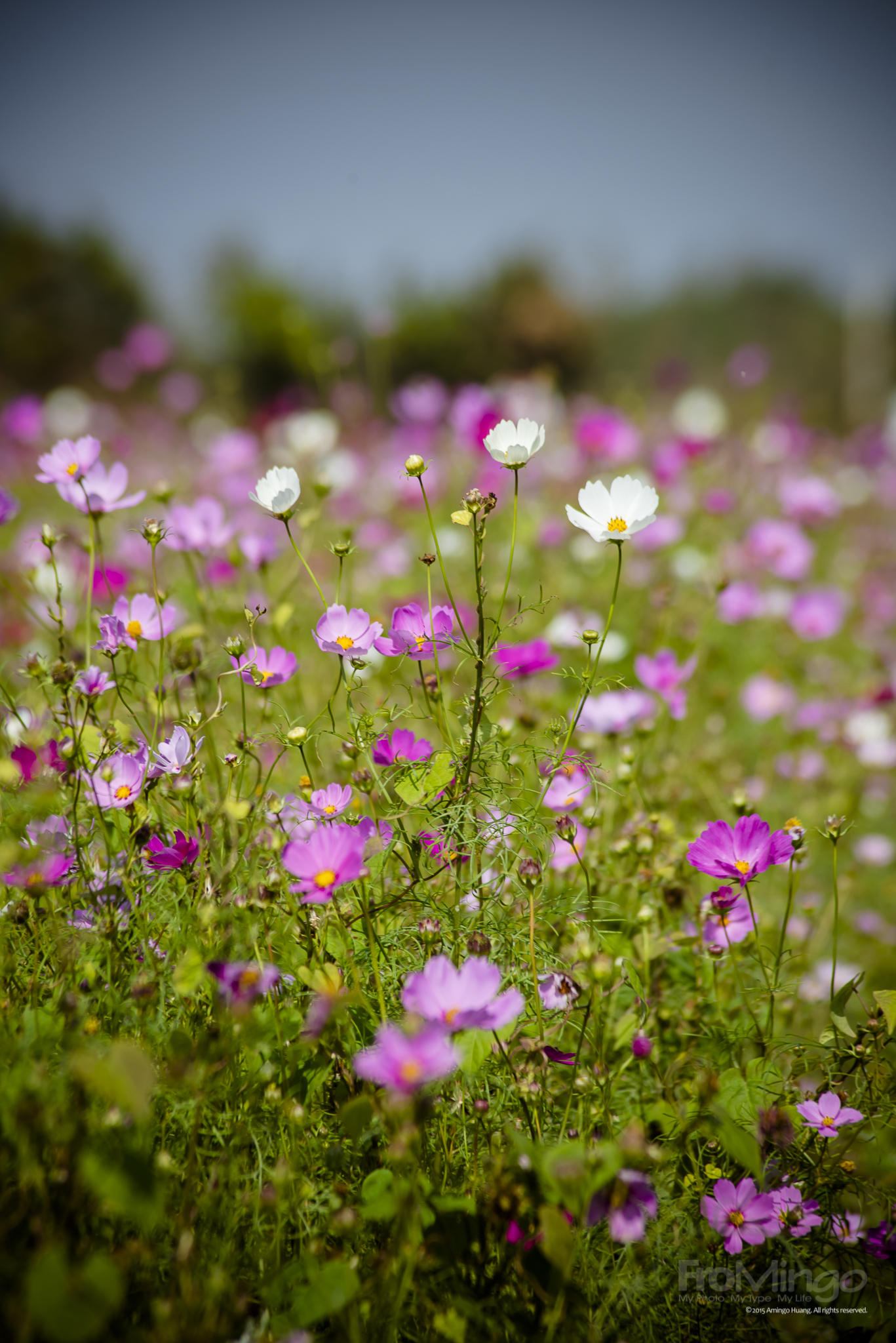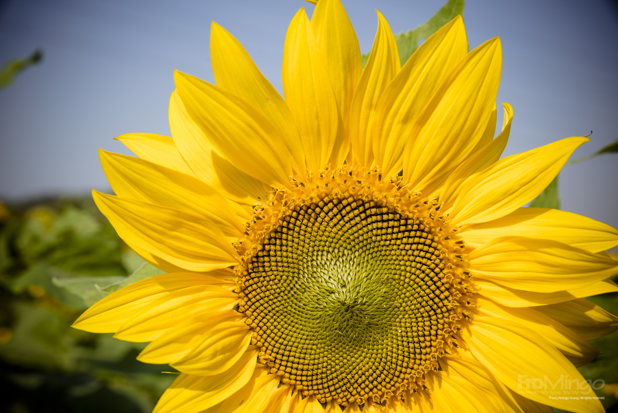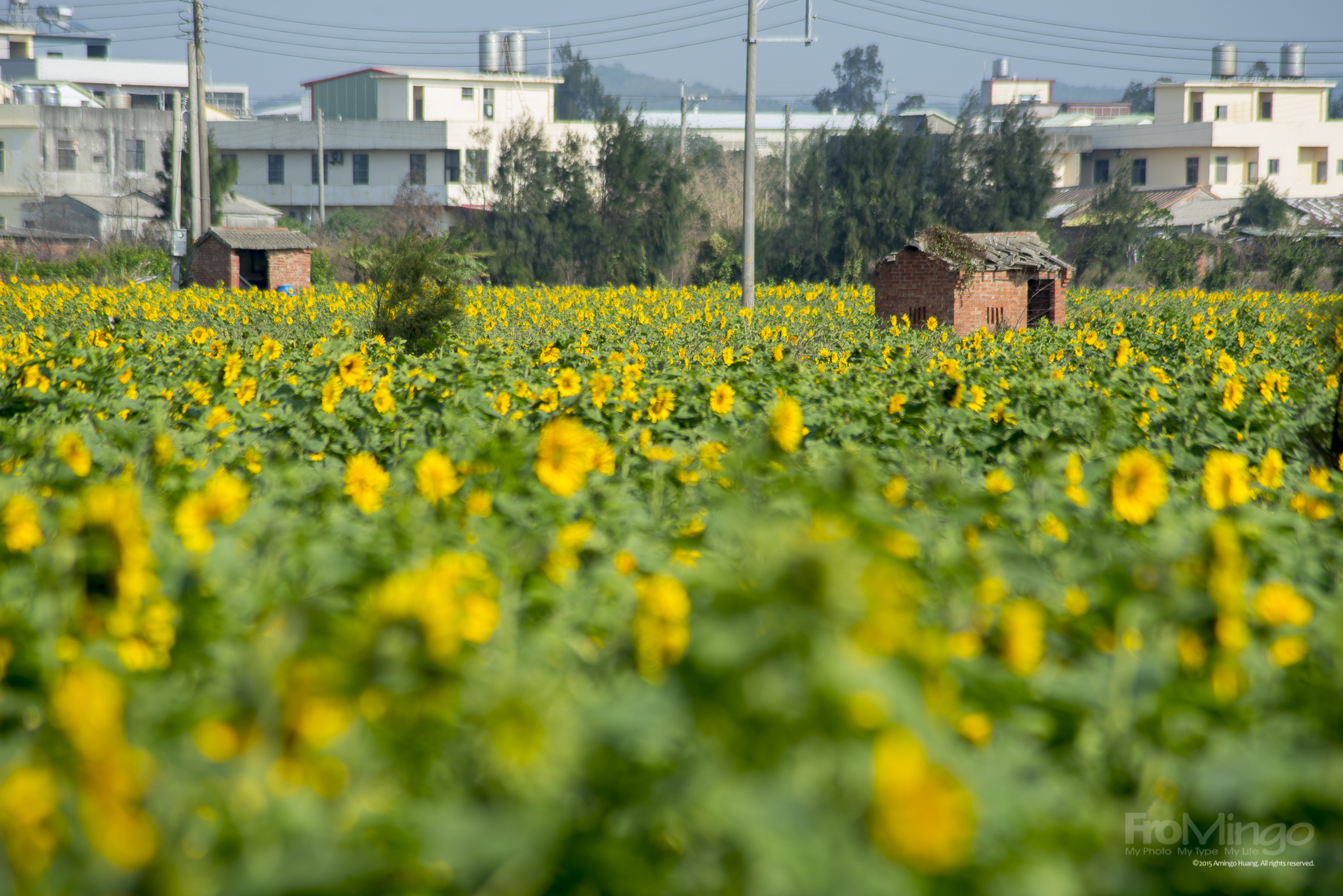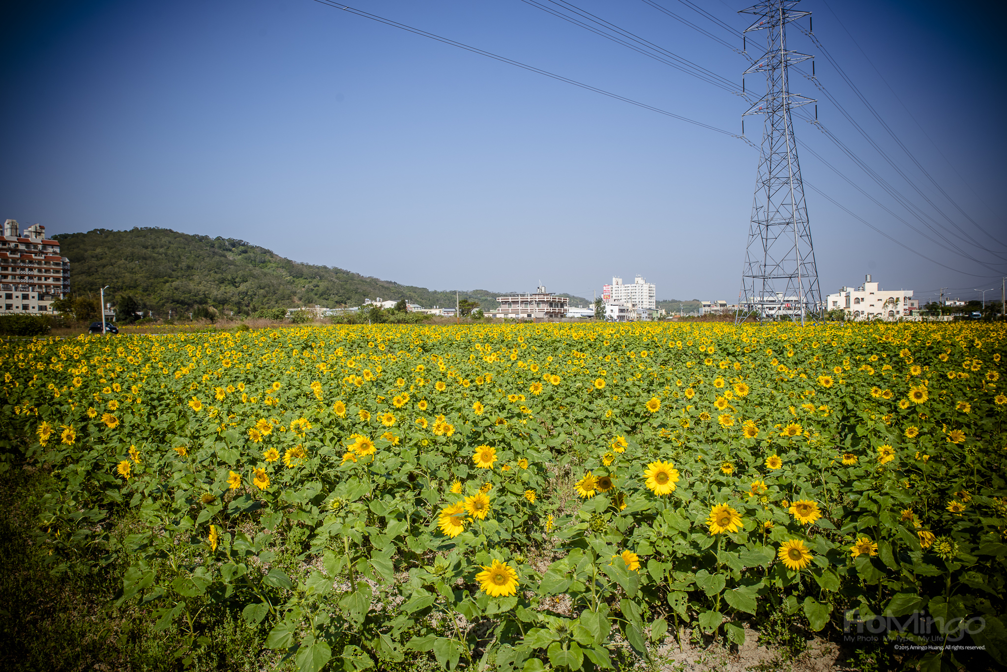 雖然是無雲的天空,不過天空並非湛藍,而是帶了白霧的樣子(空汙吧),且東北季風的大吹著,想好好靜下來拍蜜蜂或者單一花朵,都是件難事,但至少『我在向日葵花海裡~~』