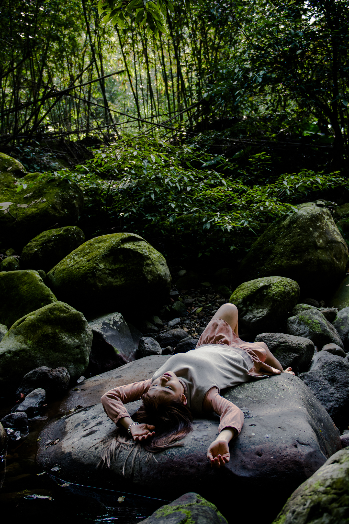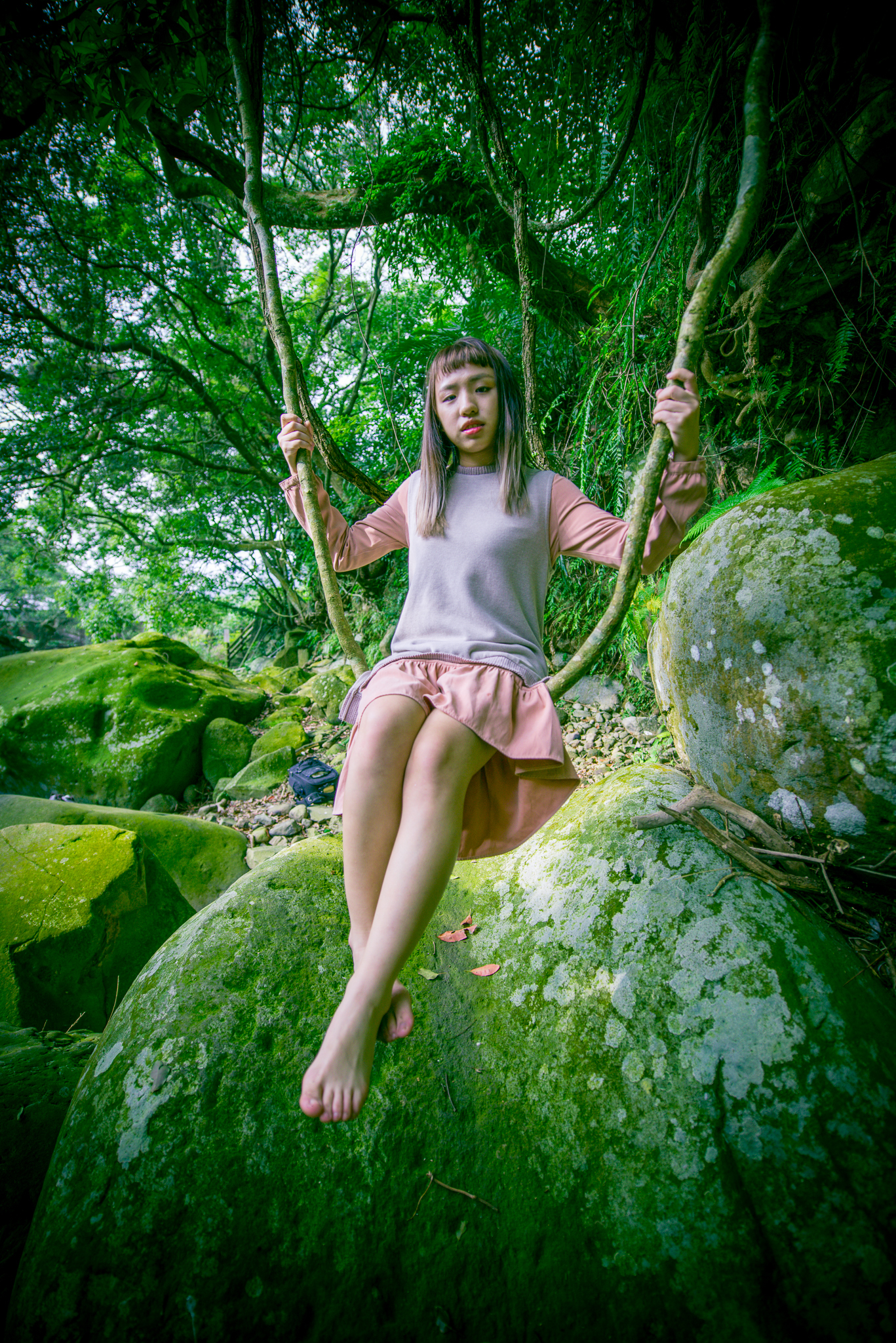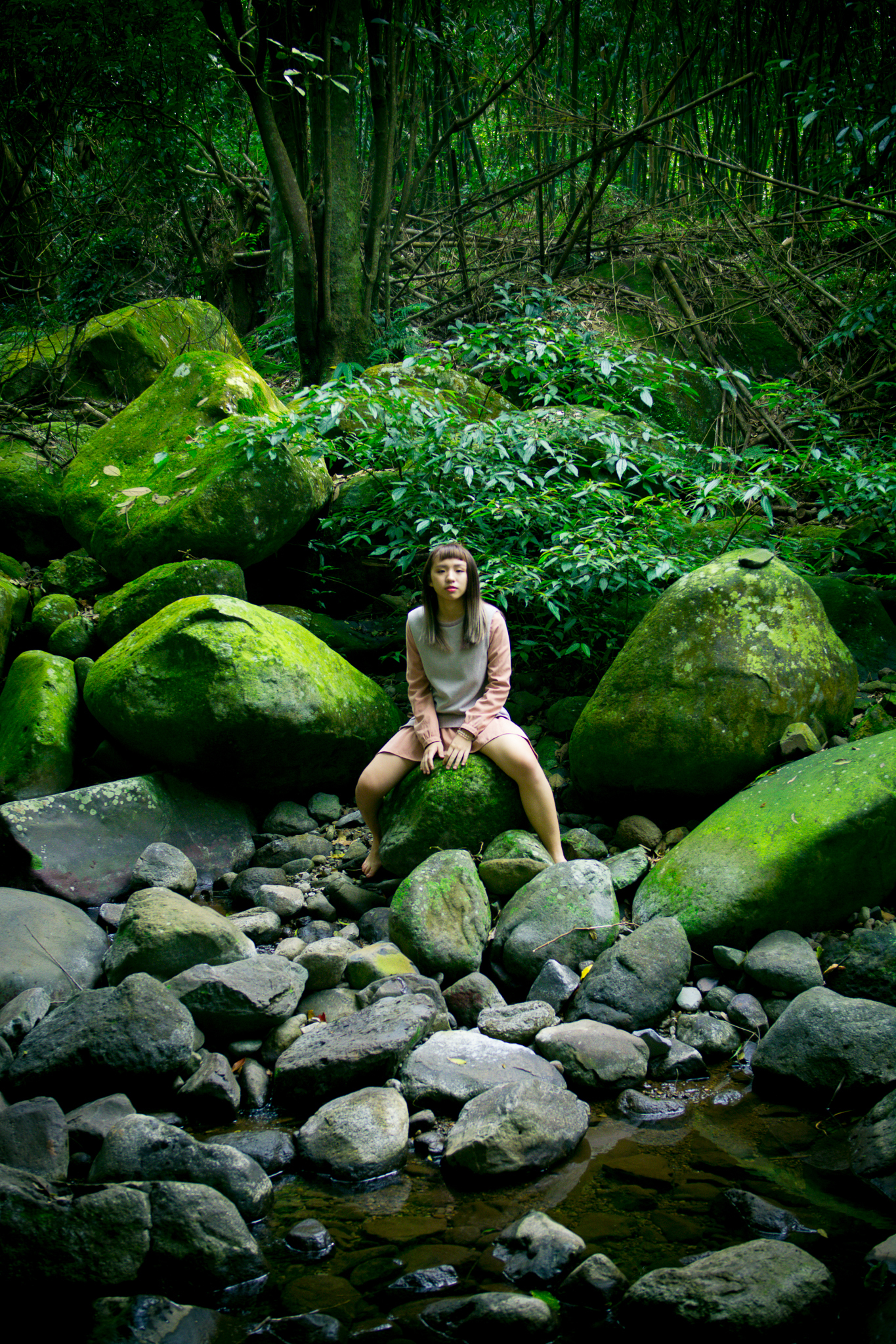 大石上的苔蘚,以及溪流旁的竹林與大樹,攀延在大樹上的老藤,都會成為女孩們的舞台。