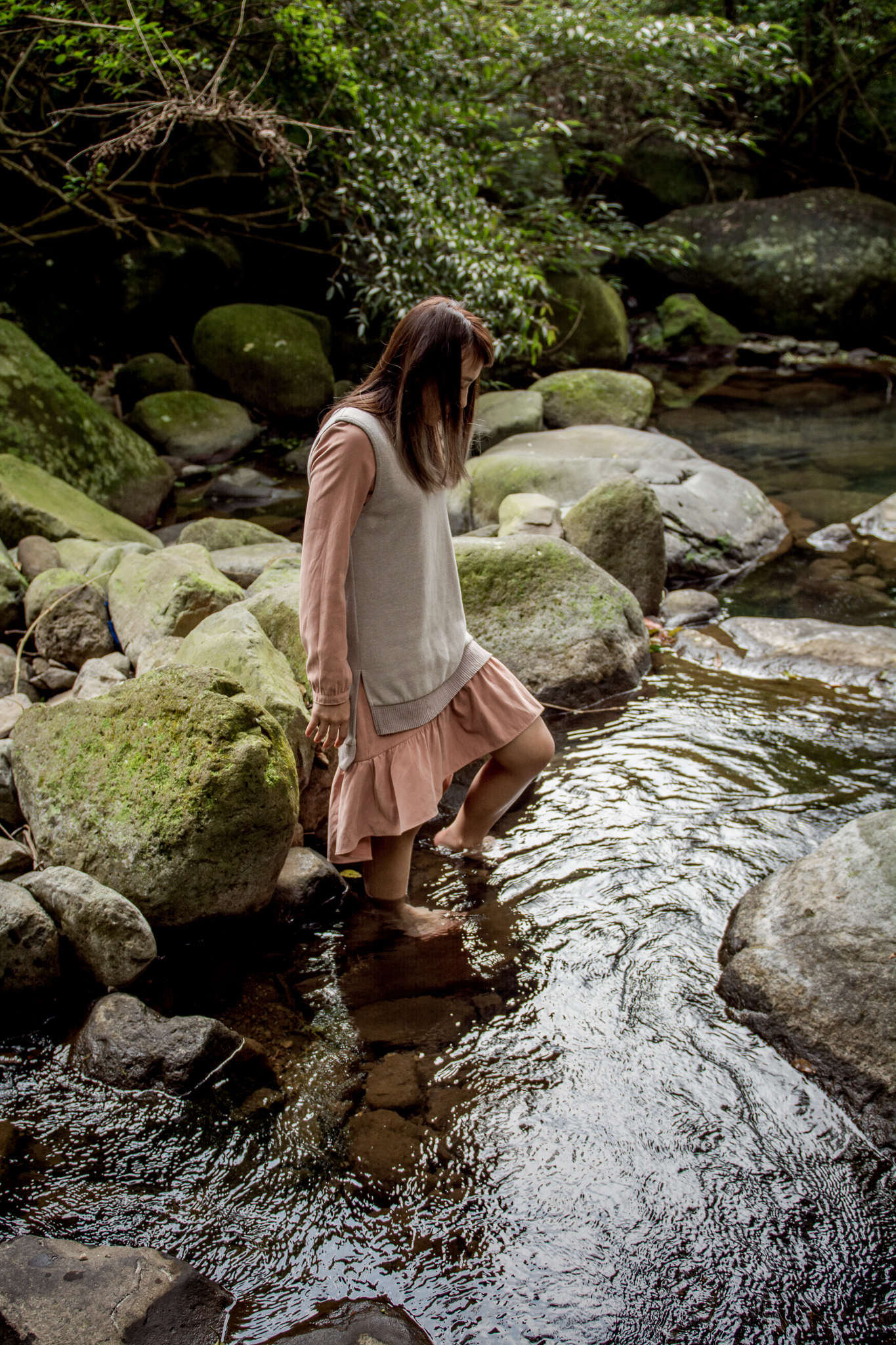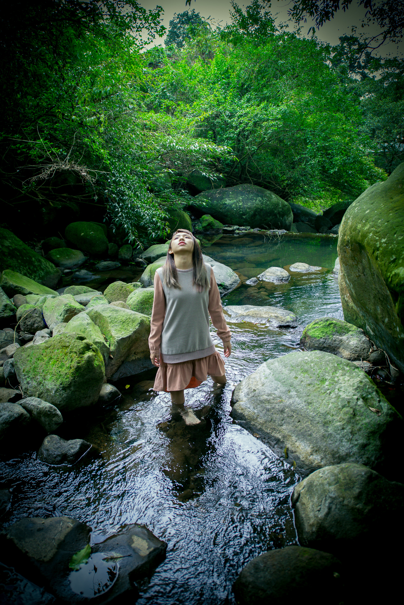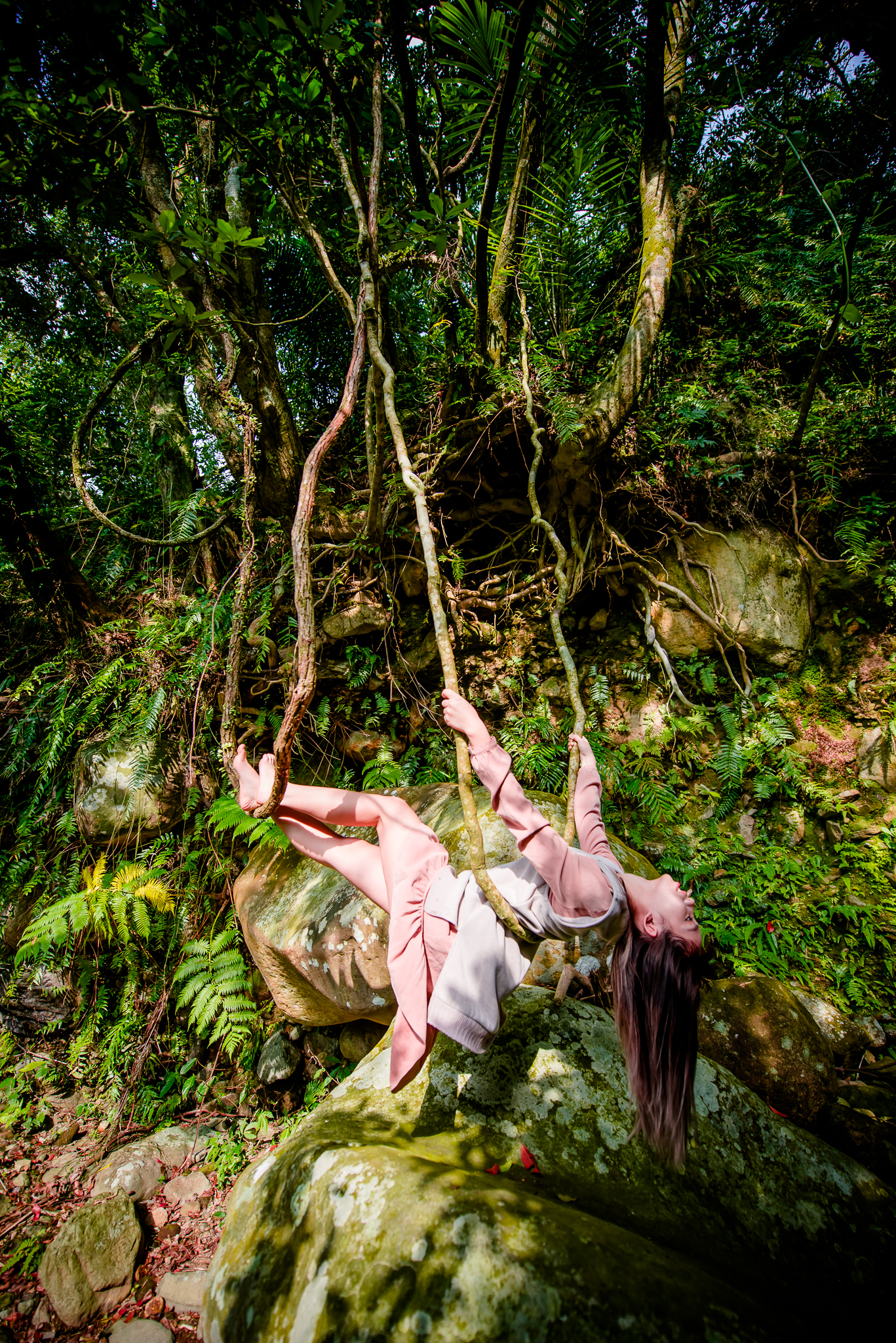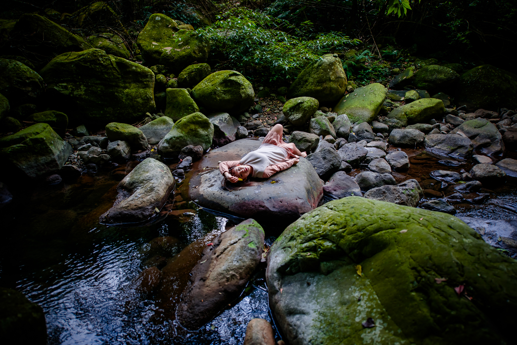 大石上的苔蘚,以及溪流旁的竹林與大樹,攀延在大樹上的老藤,都會成為女孩們的舞台。