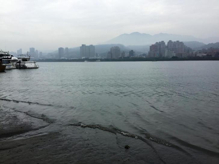 嫂嫂到了車站大廳,在或坐或立或走動的眾多人中,撥了電話過來,順利的找到了阿秋和我。嫂嫂領著我們往回走,到了捷運站,順利的搭了紅線的車到民權西路,轉黃線的捷運到了蘆洲站,再從那兒搭公車到獅子頭站下車,然後沿著馬路往前走,車輛很多,呼嘯而過,幾乎是擦身而過,走在路上頗沒有安全感,所幸一百公尺很快就走完。我們拾階而下,面對的是正在退潮的淡水河,天色有些迷茫,不是個晴朗的天氣。