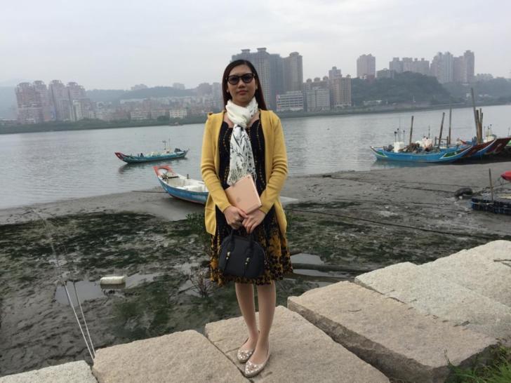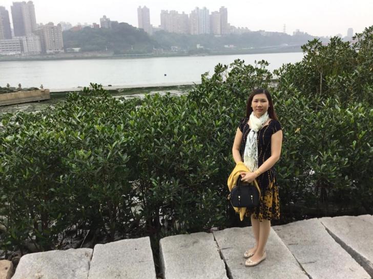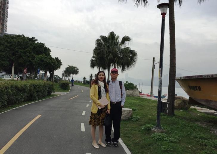 我們沿著自行車道行走,有時遠眺關渡大橋,有時也走到河灘邊欣賞河水與漁船。許多人騎車前行,有的跑步運動,有的在遛狗,也有一些像我們一樣漫步及欣賞風景的遊客。沿途除了青草綠樹之外,也有許多開了花的樹木。阿秋要我這裡為她照一張,那兒拍一張,水湄樹旁到處都想拍攝。女生大概都比較愛美,喜歡照相吧?真是所謂的螳螂捕蟬黃雀在後,我忙著為阿秋拍照,嫂嫂正好趁機捕捉我拍照的神態。讓她捕捉到的畫面應該是最自然的吧?