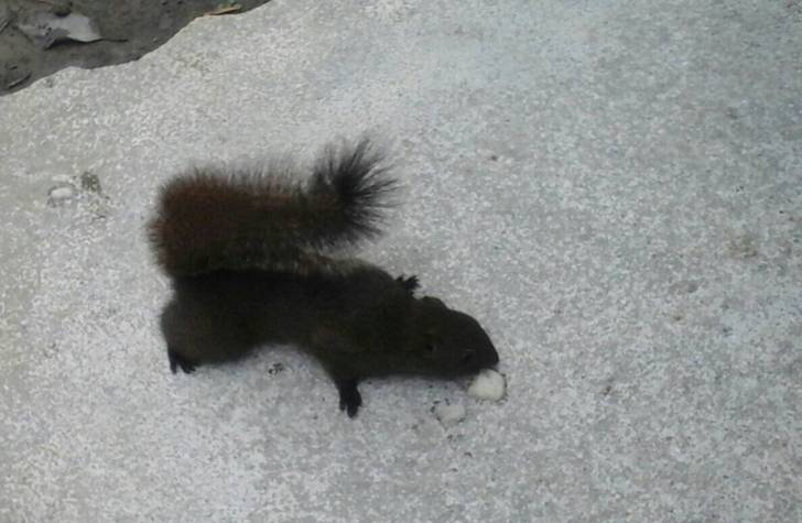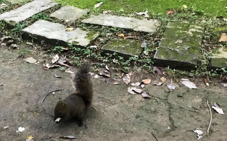 嫂嫂和阿秋終於跟我走到那樹蔭很多的角落,找了石桌和石椅坐了下來。我打開那兩大盒的思慕昔,樹上的松鼠不怕生,好奇的遛下來,對我們東張西望。我發現這裡的松鼠毛色比較黑,和我在美國常看到的不大一樣。嫂嫂和阿秋大概是因為午餐後,肚子還是飽飽的,不太有興趣(或是胃裡沒有空間)吃思慕昔,於是一湯匙一湯匙的將思慕昔置於地上,松鼠也都不客氣的跑過來,抱著一坨一坨的思慕昔,津津有味的啃食起來,那模樣真的很有趣。
