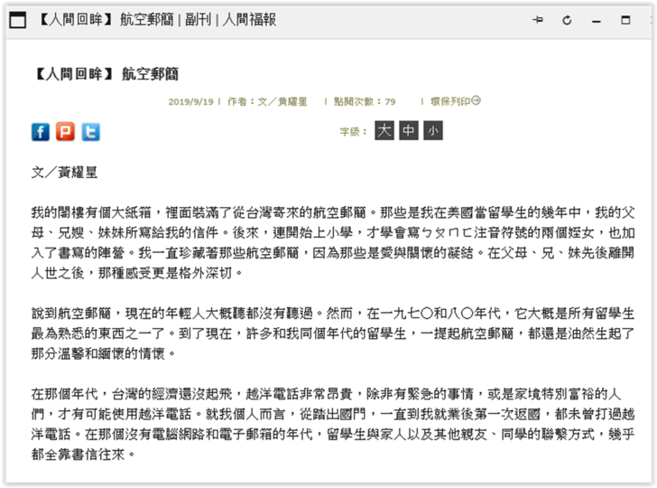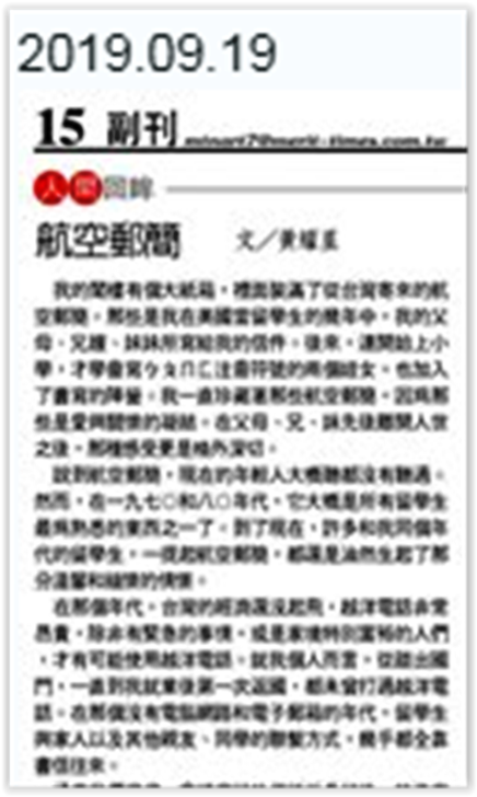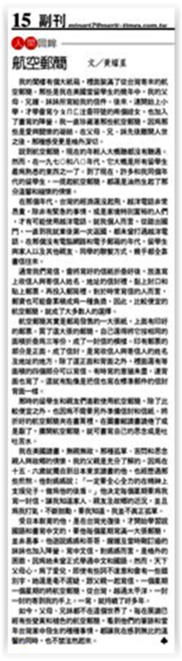 我的閣樓有個大紙箱,裡面裝滿了從台灣寄來的航空郵簡。那些是我在美國當留學生的幾年中,我的父母、兄嫂、妹妹所寫給我的信件。後來,連開始上小學,才學會寫ㄅㄆㄇㄈ等注音符號的兩個姪女,也加入了書寫的陣營。我一直珍藏著那些航空郵簡,因為那些是愛與關懷的凝結。在父母、兄、妹先後離開人世之後,那種感受更是格外深切。