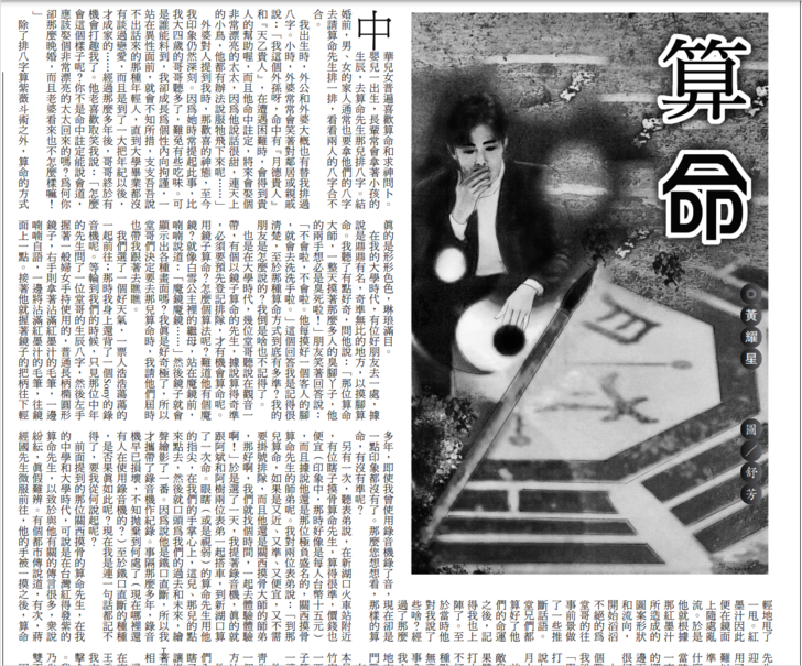 也是在大學時代,幾位堂哥聽說在觀音一帶,有個以鏡子算命的先生,據說算得奇準,必須要預先登記排隊,才有機會算命呢。用鏡子算命?怎麼個算法呢?難道他有個魔鏡?就像白雪公主裡的繼母,站在魔鏡前,喃喃說道:「魔鏡魔鏡……」然後鏡子就會顯示出各種畫面嗎?我真是好奇極了,所以堂哥們決定要去那兒算命時,我請他們屆時也帶我跟著去瞧瞧。