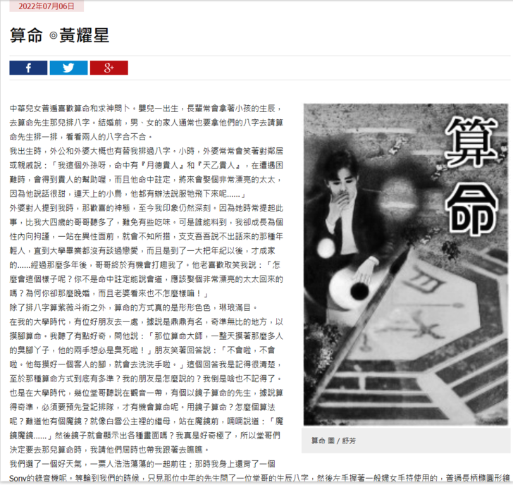 - 1樓. Sir Norton 魯賓遜,救命!2022/07/21 21:12What a pathetic subject and huge wastes of lives.有人傳來私訊說讀了「算命」後,哈哈大笑,覺得文章幽默有趣。很遺憾,您卻如此厭惡和排斥,未能獲得您的認可。☆耀星☆ 於 2022/07/22 10:15回覆