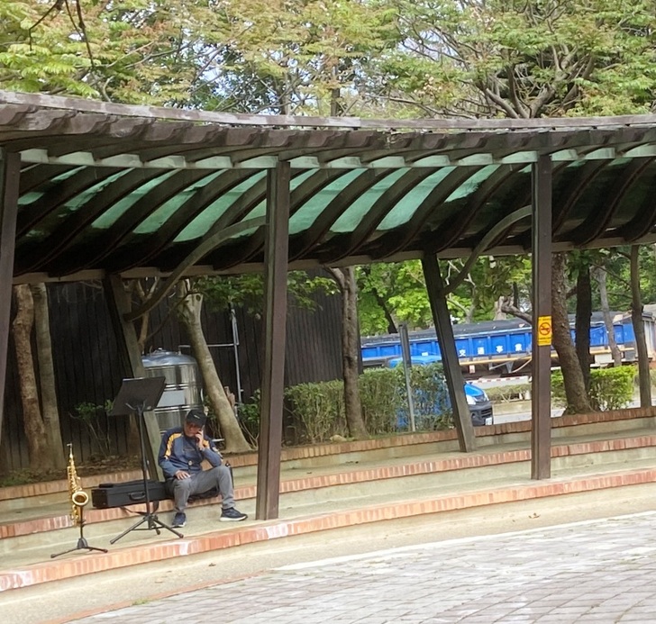 在公園前面的廣場,我看到有人在排練薩克斯風。他吹奏的樂曲熟練動聽,顯然是一個專業的薩克斯風演奏者。他演練了許久,才坐下來休息。我則悄悄地拿出手機,為他拍了一張照片。