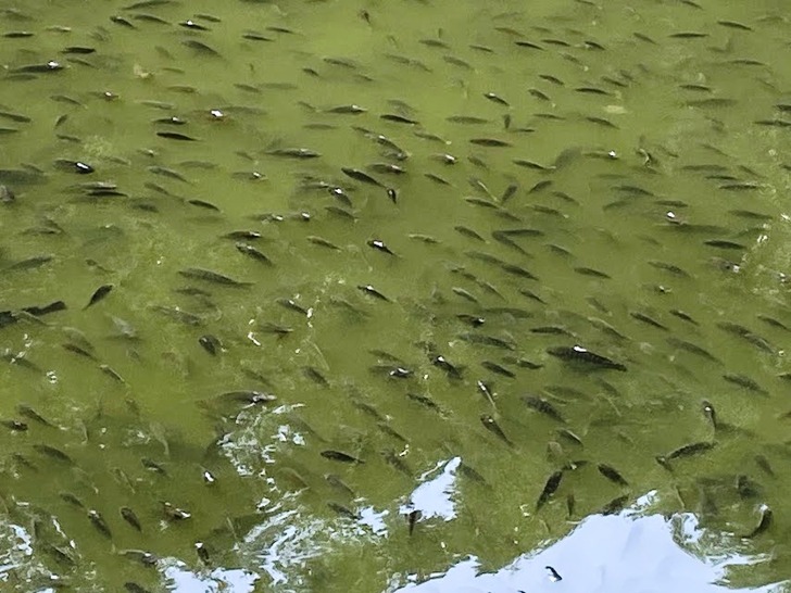 池裡密密麻麻的灰黑色魚群