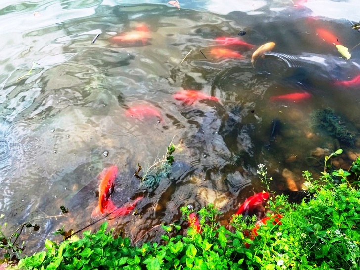 大池裡的魚群非常的活躍,黑壓壓的擠滿了沿岸的水邊,一大群一大群的。每條魚在三隻手指到一個巴掌大小,數量極為驚人。除了這些灰不溜丟的魚群之外,還可以看到許多色彩鮮艷的錦鯉魚夾雜其間。因為這些錦鯉魚不但顏色顯目,而且非常的大條,很容易引起人們的注意。我相信這些錦鯉魚不會是大池裡土生土長的魚類,不知是否有人刻意在此放養(或是放生)?池裡還有許多的烏龜;大的有如小臉盆,小的只有我們的手掌大。牠們優雅的游動在魚群中。