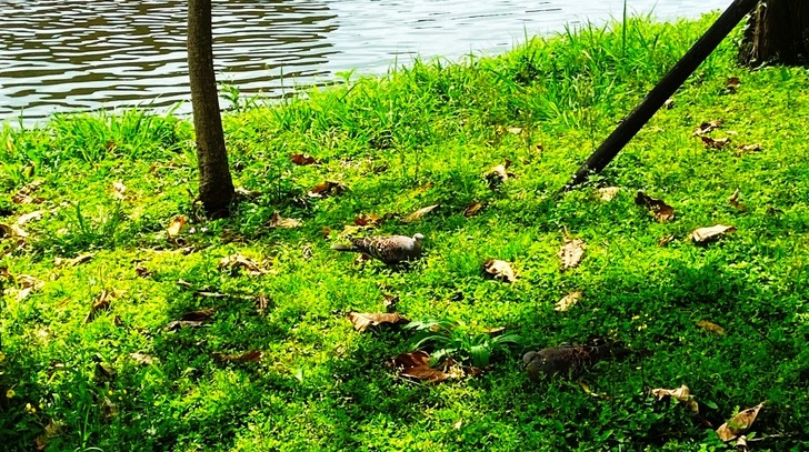 在大池不同的地方有不同的人在餵魚,顯得相當的熱鬧。但在一個比較僻靜的角落,我看到一隻有細長雙腳的白鷺鷥,站在湖畔的綠草水面上,用牠長而又尖的喙只輕輕的往水裡一啄,一條三指大小的魚兒就夾在牠的喙裡了。牠輕鬆的把魚兒吞下後,便悠閑的,若無其事的踱著步子,走到另一個角落了。