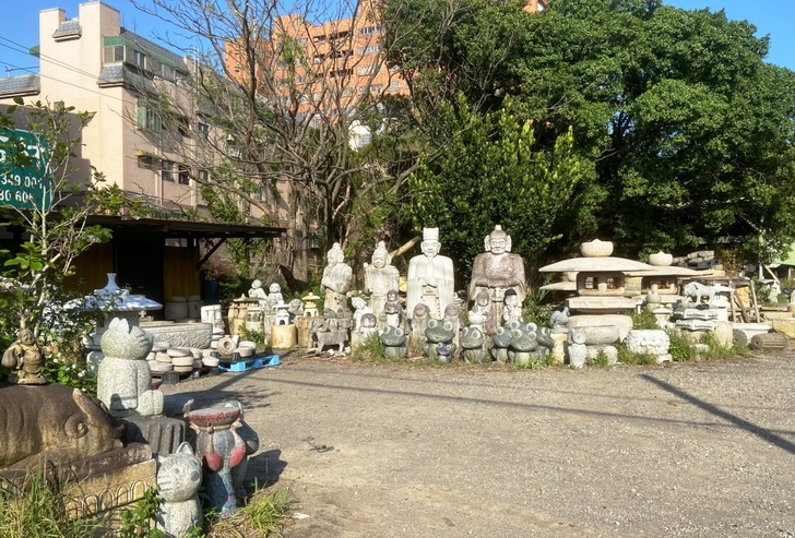 石材店擺滿石雕的院子